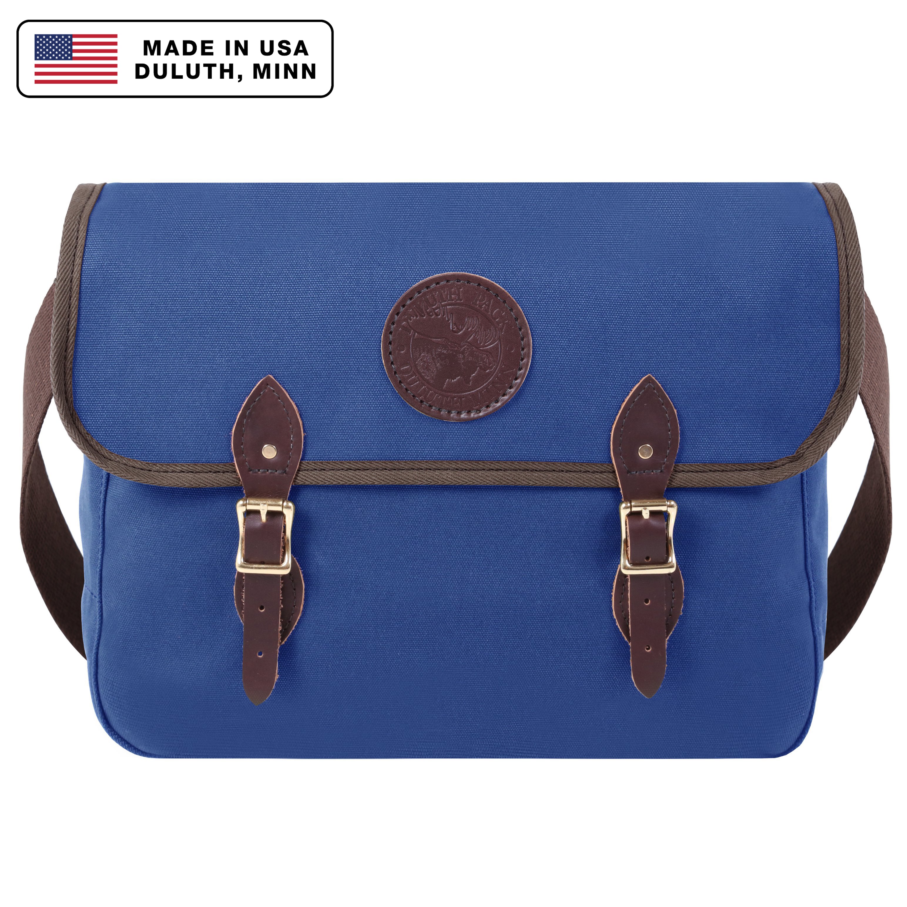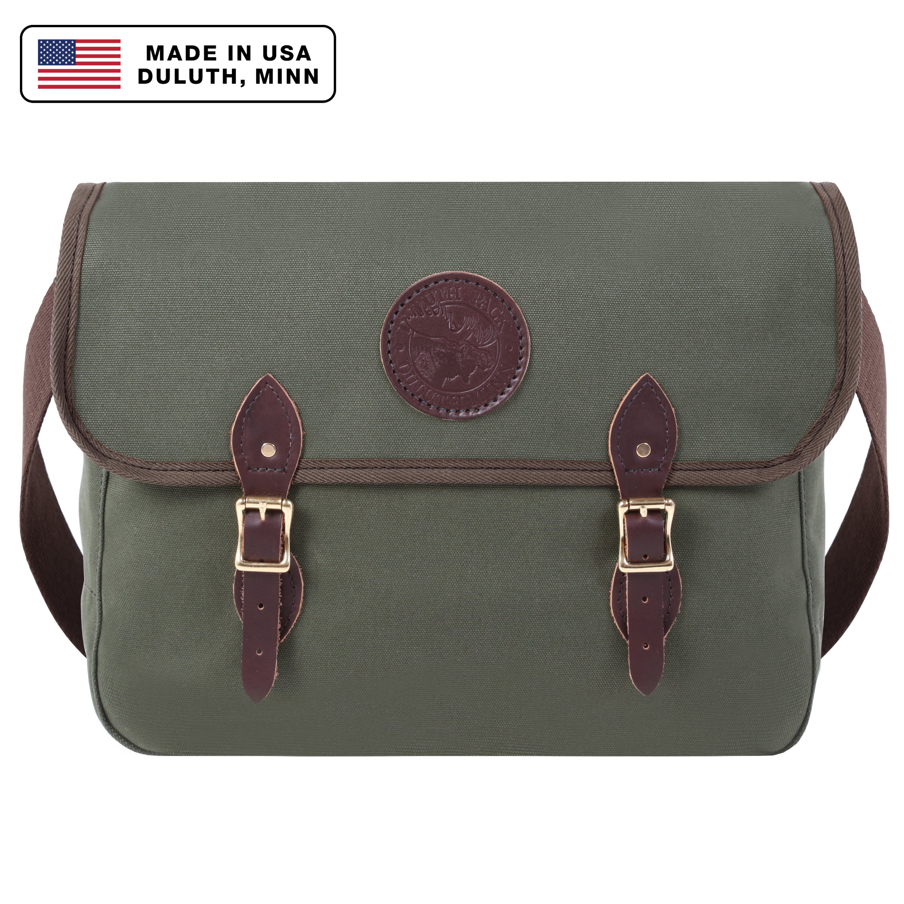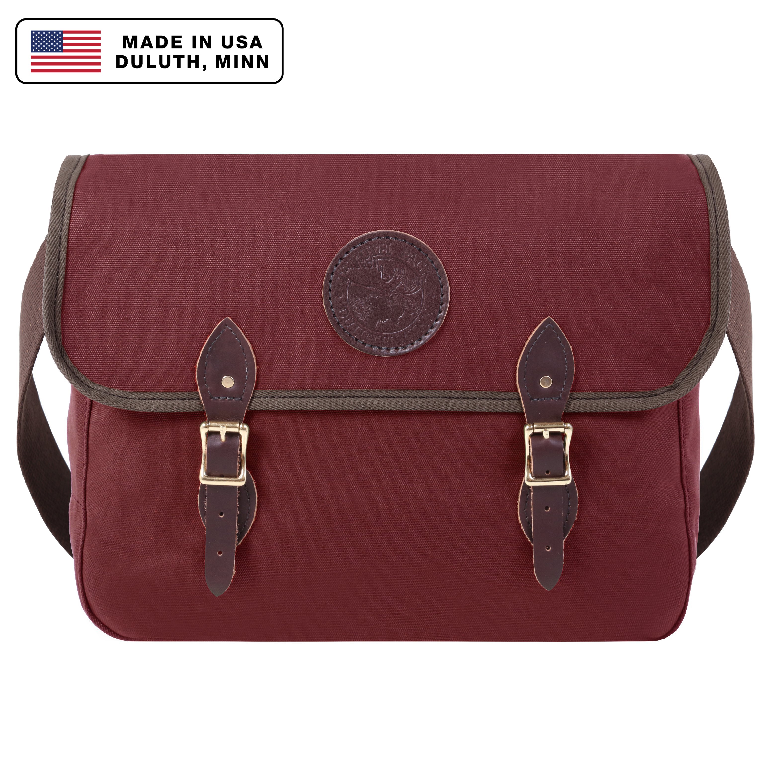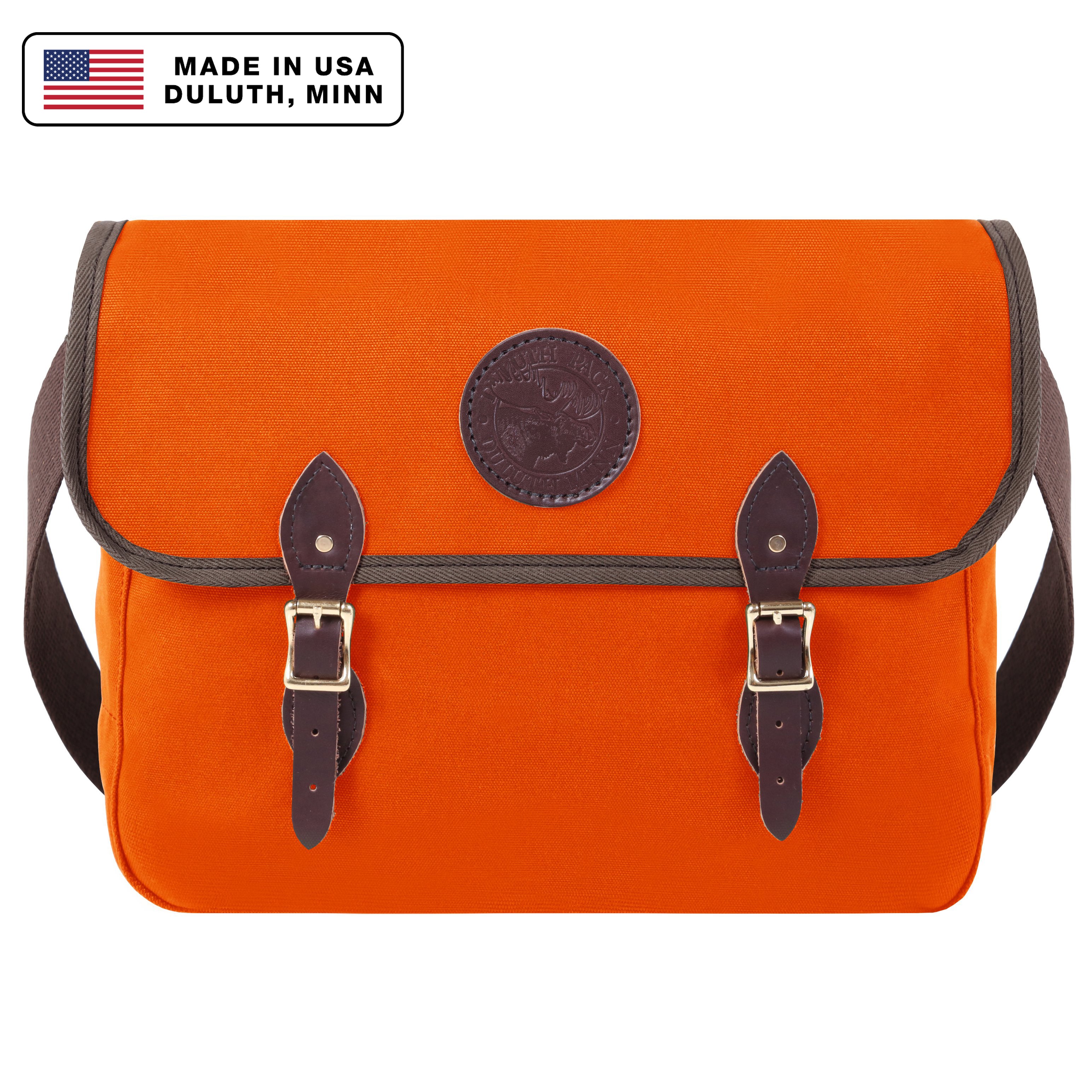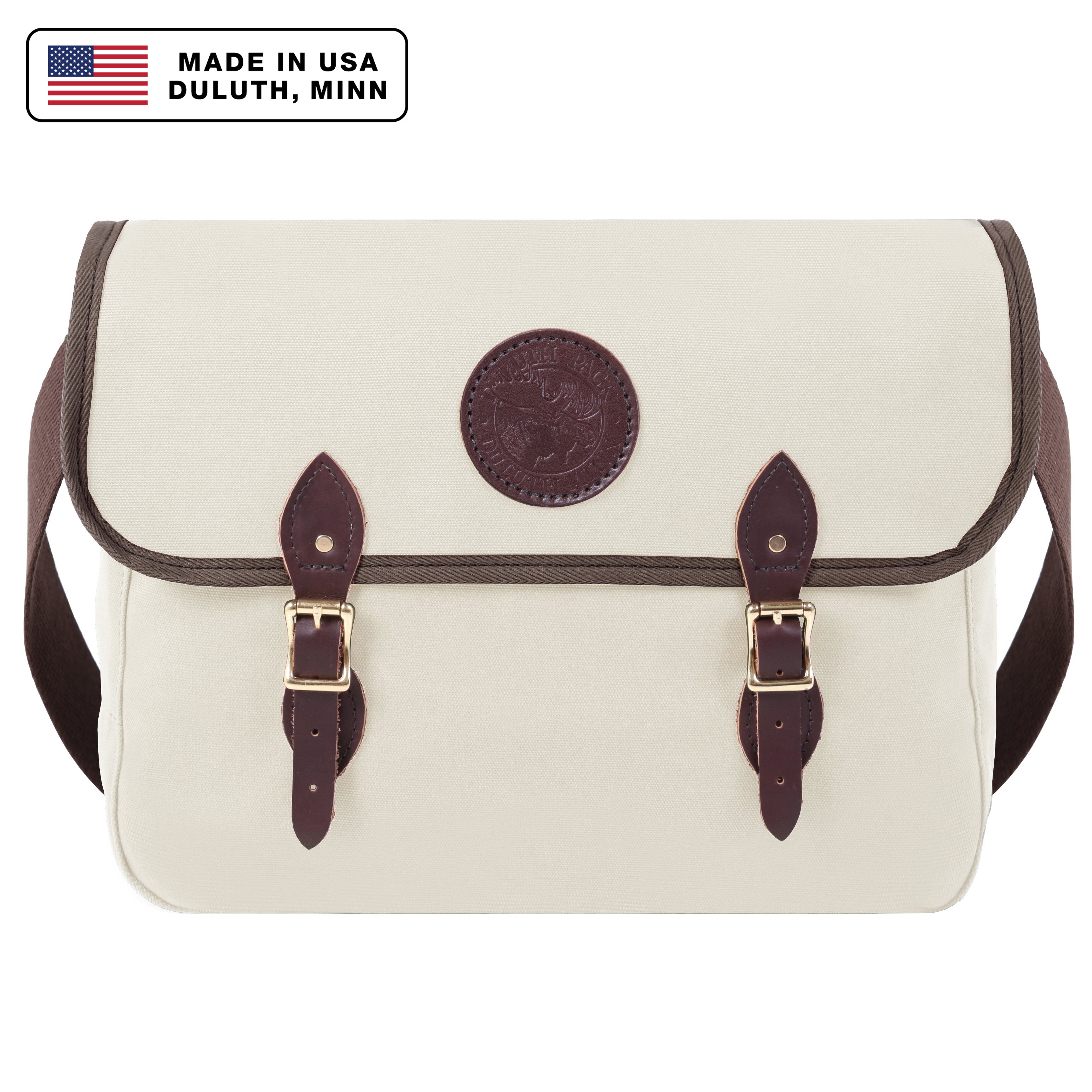 - Leather straps and high-quality roller buckles secure fold-over flap.