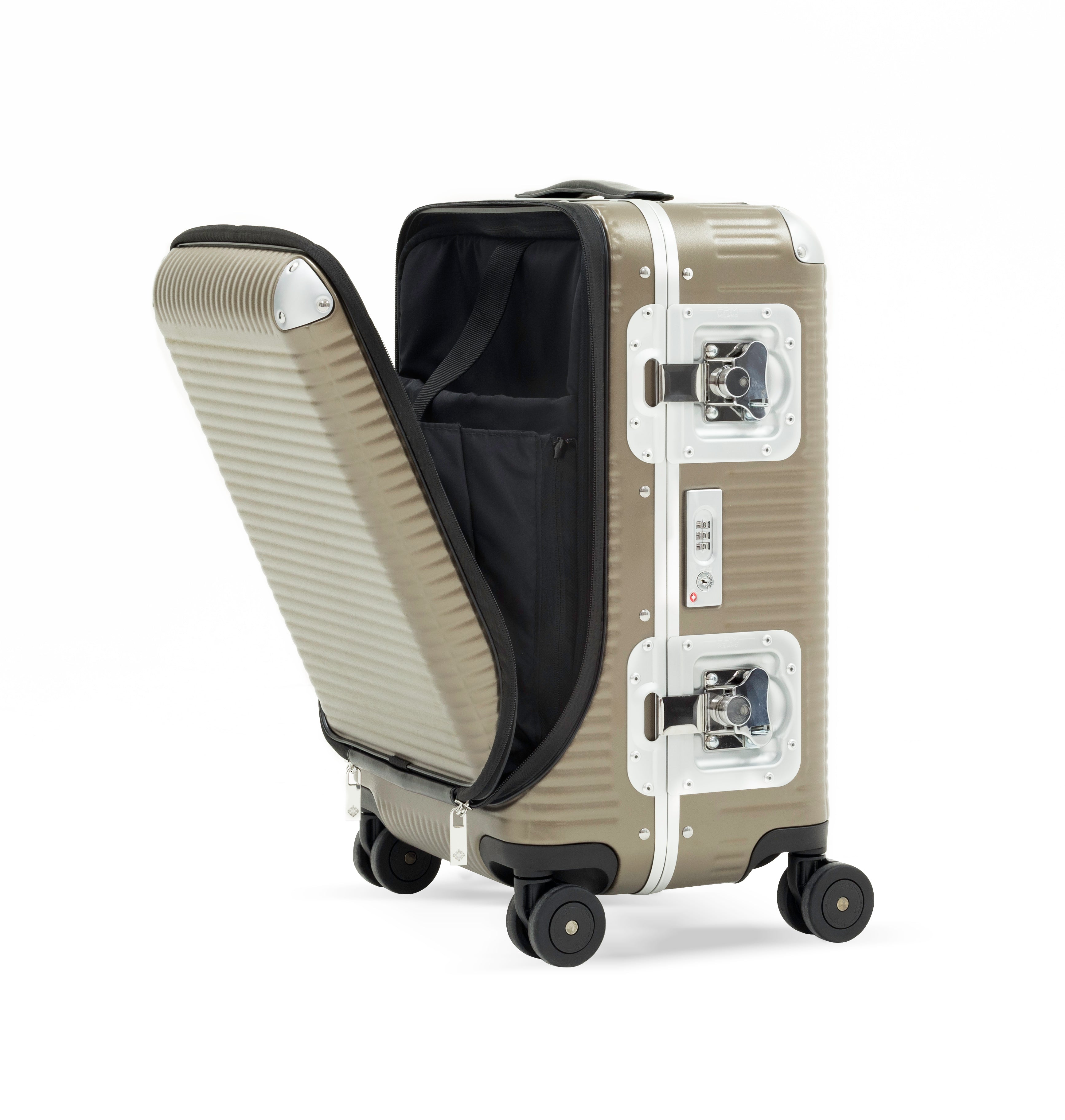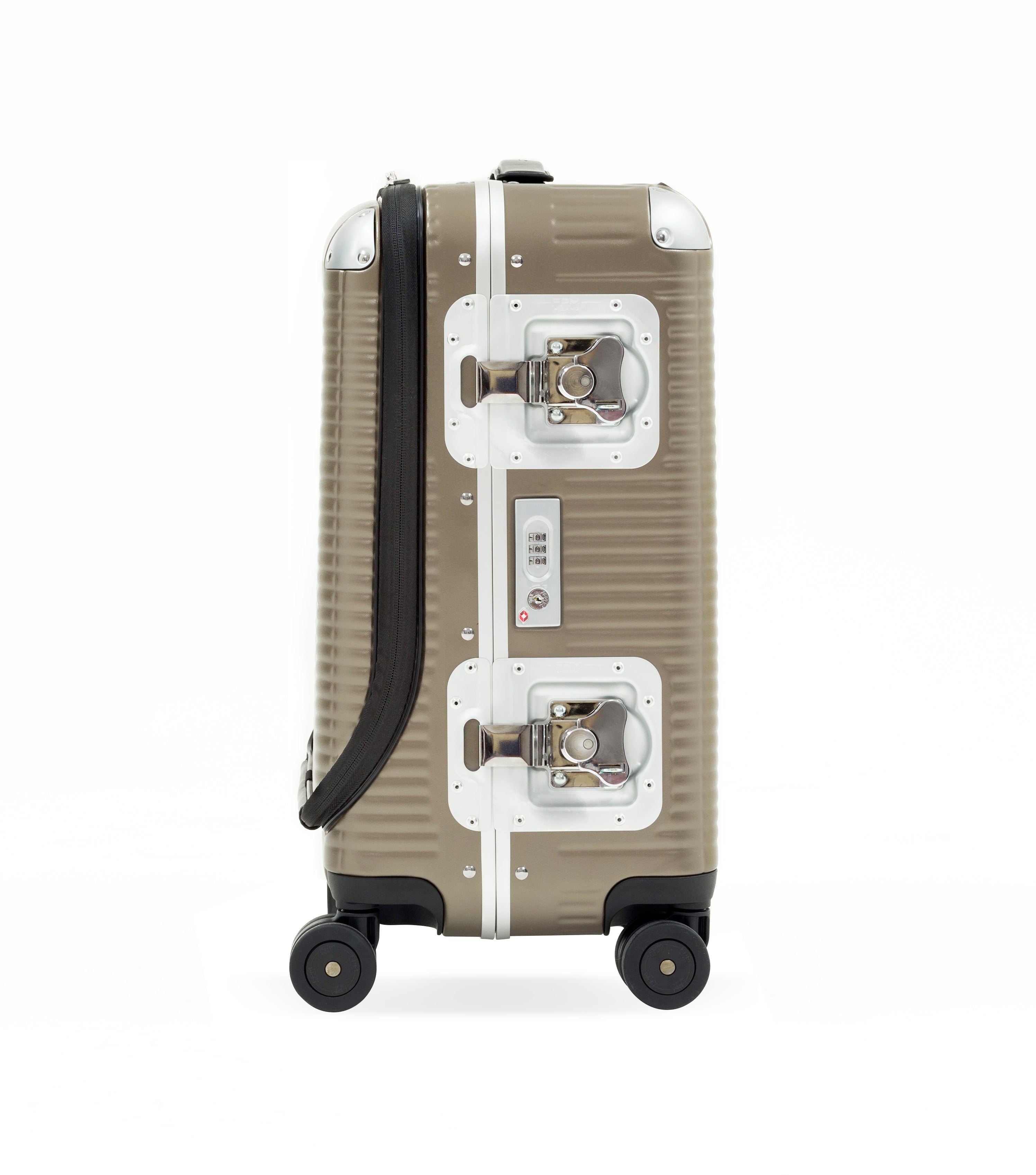 100% Makrolon polycarbonate. 4-wheeled bag. The wheels guarantee great stability and smoothness. The suitcase has a TSA lock incorporated combined with two maxi butterfly locks that ensure safety. The two handles are in fine Italian leather, engraved with FPM logo. The interior of the suitcase is made of removable lining and come complete with elastic straps in both sides that make the interior well arranged: the nickel clip embellish the product. Ideal for 10/11-day journeys.