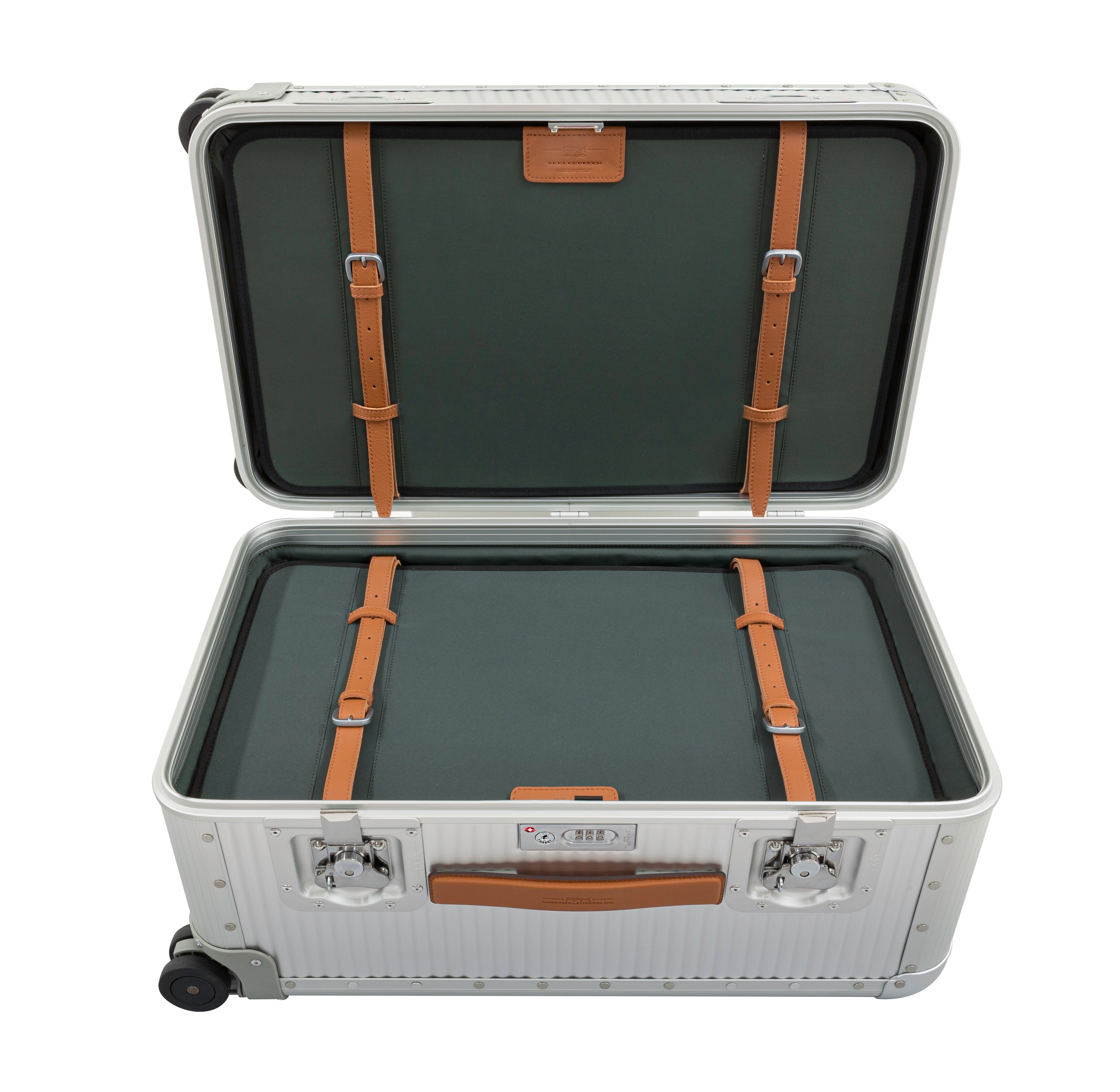 100% Aluminum, 4-wheeled Made in Italy suitcase. The wheels guarantees great stability and smoothness. The suitcase has a TSA lock incorporated combined with two maxi butterfly locks that ensures safety. The handles are in fine Italian leather. The interior of the suitcase include handcrafted leather belts. The lining is padded and removable. The interior organizer allows for optimum arrangement of contents. Ideal for 13/14-day journeys.