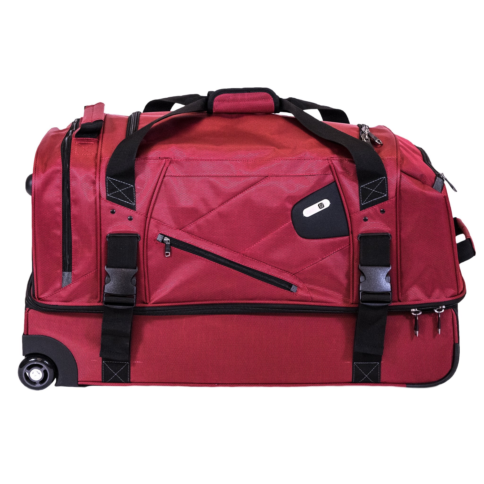 The Tour Manager rolling duffle bag combines the ample storage space of your standard duffle bag with the ease of transport of your standard rolling luggage suitcase. It offers a spacious, split level storage compartment that can ether divide in half, with a zipper pass through, or function as a large single storage space. This rolling duffel easily rolls through airports on corner mounted wheels, and the telescoping grip handle makes transport a snap. The duffel bag also features additional storage in front and rear zipper compartments, A water resistant bottom ensures that your items will stay moisture free during travel.