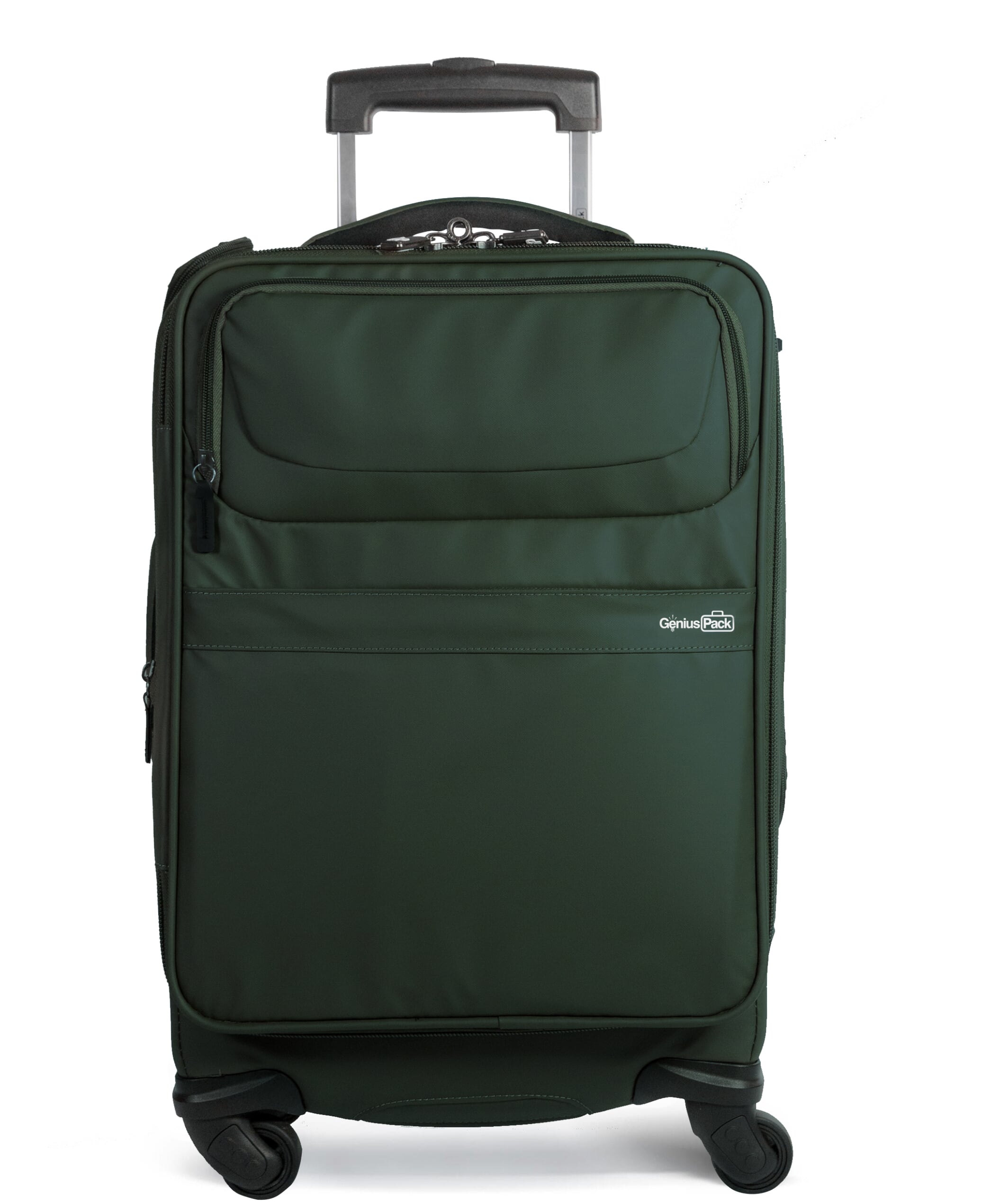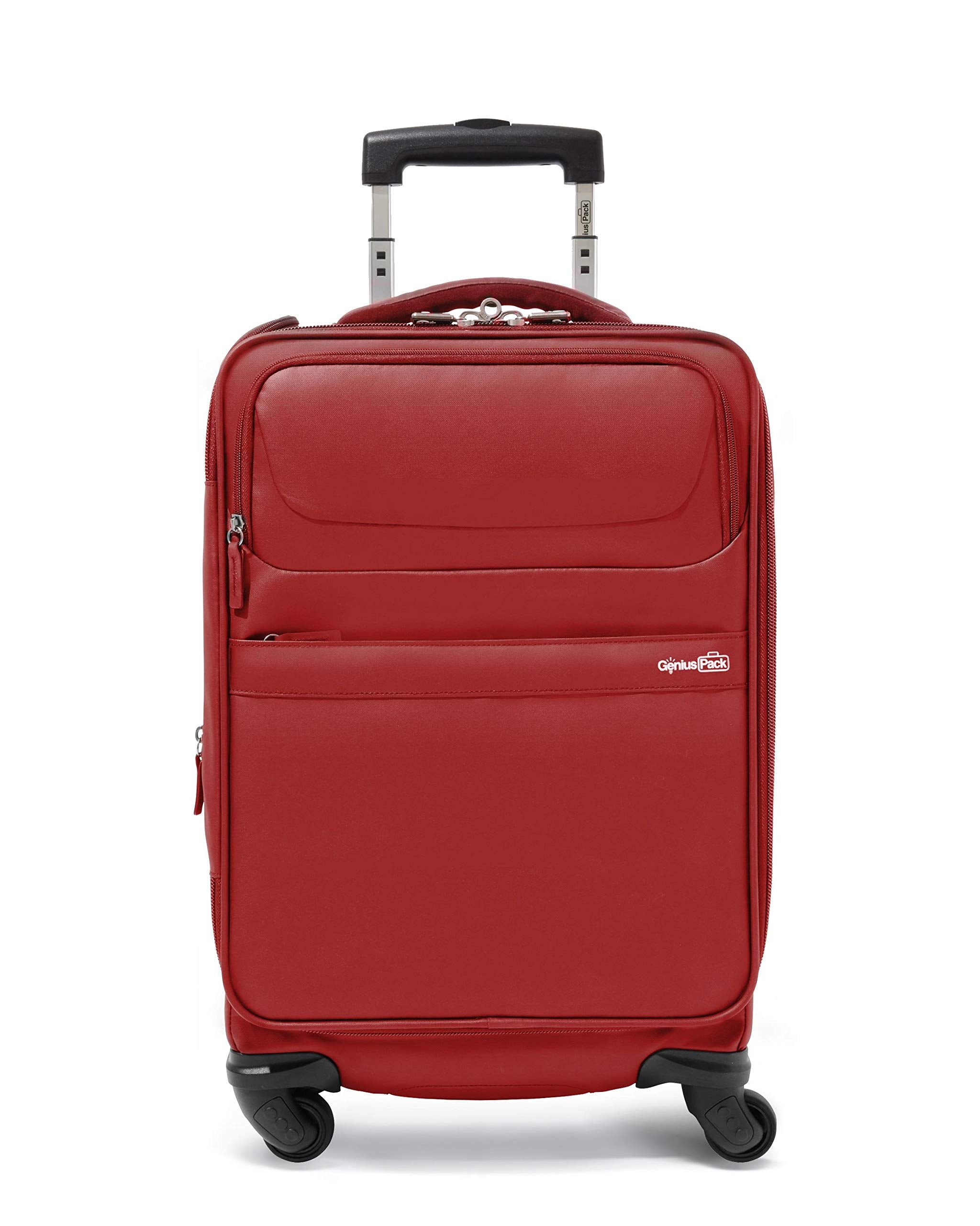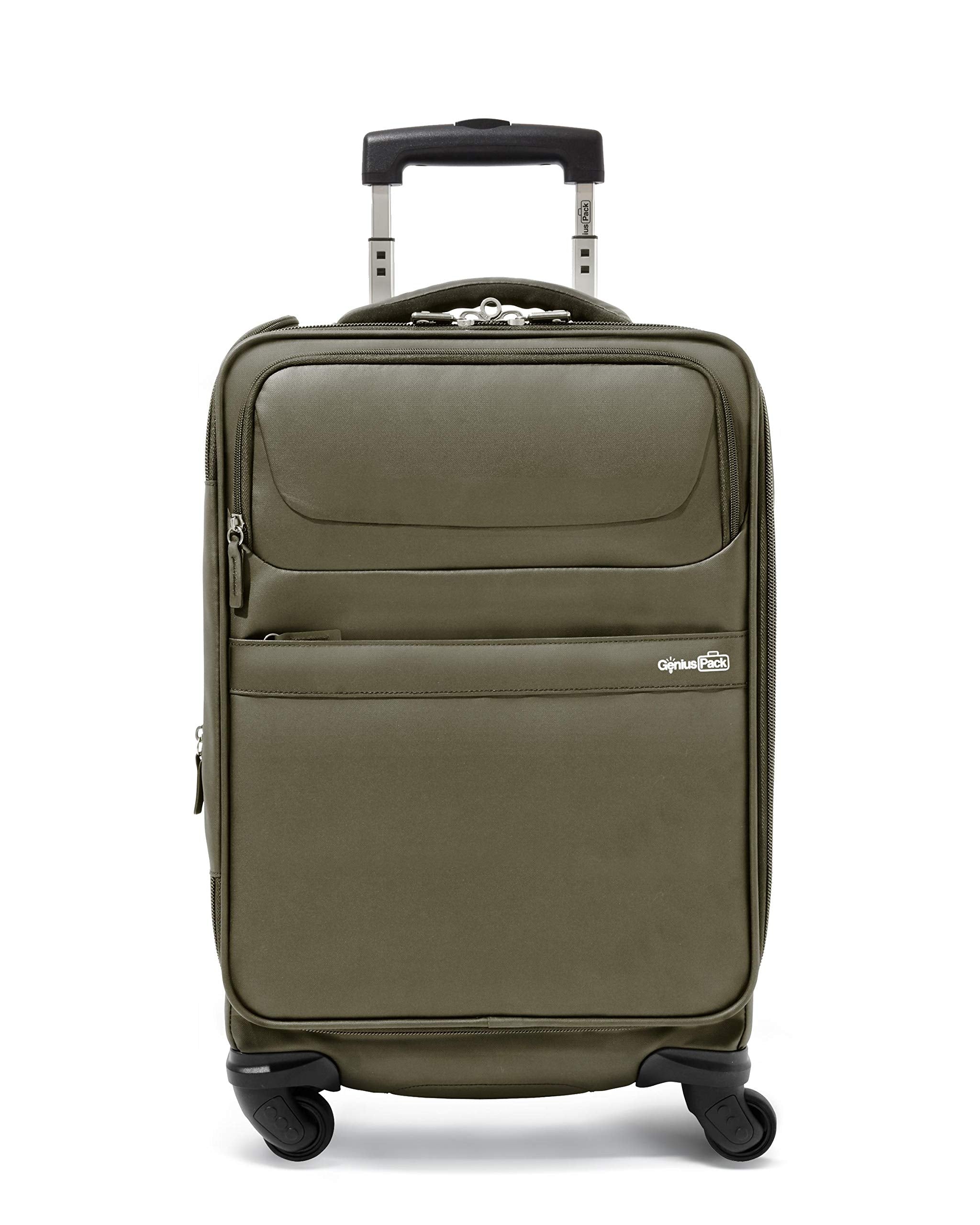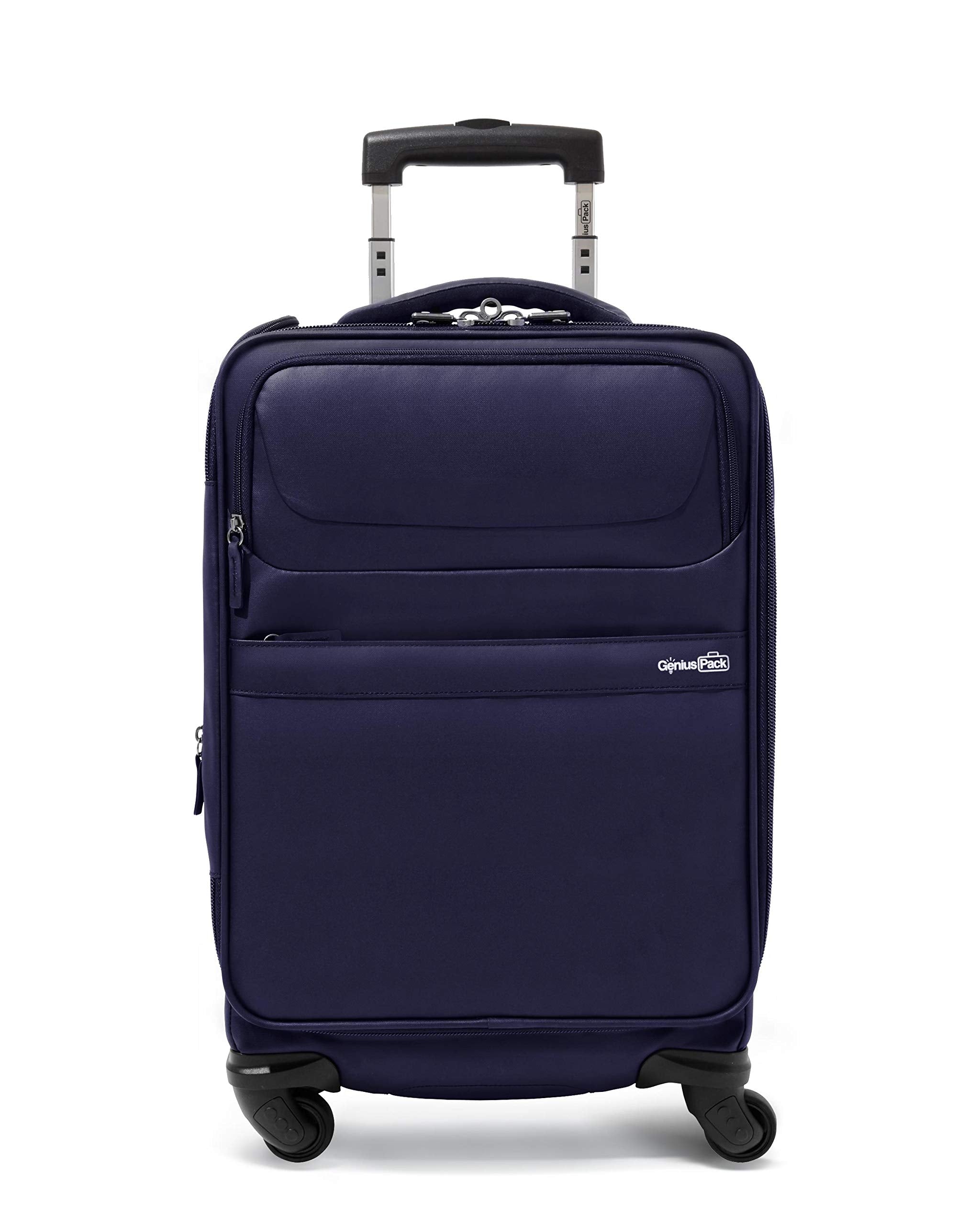 Titanium Meet the Carry On designed for extreme organization and convenience. Includes Genius Pack's patented Laundry Compression Technology, 360-degree frame-injected spinner wheels, internal category compartments- to name a few. The engineers behind this product made sure every step of the journey becomes hassle free. THE FEATURES Third generation model with numerous enhancements Voted best Carry On Bag by Travel & Leisure and Fodors Travel Patented Laundry Compression Technology keeps dirty clothes separate from clean Integrated air-valve expels air to condense clothing Laundry bag is removable. Just zip out and clean Designated compartments for Socks, Chargers, Undergarments Exterior pockets for water bottle, magazines, passport Integrate the GP Charger to recharge smartphone from bag (sold separately) Starts raining? Pop out the GP Micro Umbrella from top of case (sold separately) Permanently embedded checklist to ensure all essentials are packed Jacket wrap technology: Jacket straps onto bag while gliding in the airport Expandable: Zip to unleash 25% more packing space Includes add-a-bag strap to attach personal bag Retractable ID Card: Hides information. Pull tab to view or insert business card Maximum carry on allowance: Approved by major airlines. Never check another bag THE CRAFTSMANSHIP 360-degree frame-injected spinner wheels for a smooth roll High strength 840 denier ballistic nylon with polyurethane coated trims Durable honeycomb frame acts tough against mishandling 100% aluminum telescoping handle with 2 lock positions Memory foam-filled top and side handles for extra comfort Easy-grab bottom handle for overhead bin access Abrasion, UV & Water resistant 22 x 14 x 9 in. including wheels and handles / Capacity: 44 L / Extremely light. Just 7.8 lbs