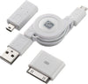 Color:White No more messy cables. This kit is supplied with micro and mini USBheads as well as a 30 pin Apple connector for charging and syncing amultitiude of devices. Can achieve high speed data transfer rates (up to 480Mbps). Conveniently retracts for tangle free storage. USB 2 compatible. 3interchangeable heads (30 pin Apple connector, mini and micro USB).