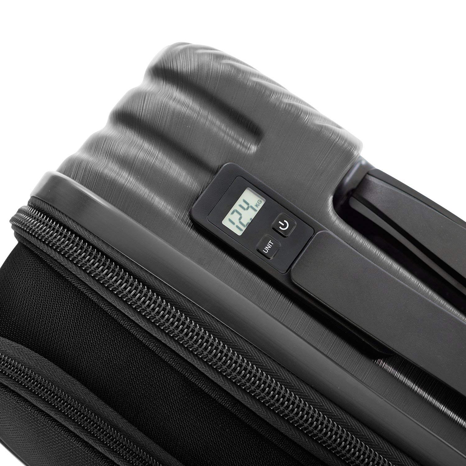 Color:Black Never worry if your luggage is over the weight limit again withthis Charge-A-Weigh 26-inch spinner luggage! This luggage features anintegrated digital scale (perfect for weighing your bag on the go!) as well asa built in TSA combination lock. The fully lined interior features a buckledcompression strap as well as multiple pockets to keep your belongingsorganized.