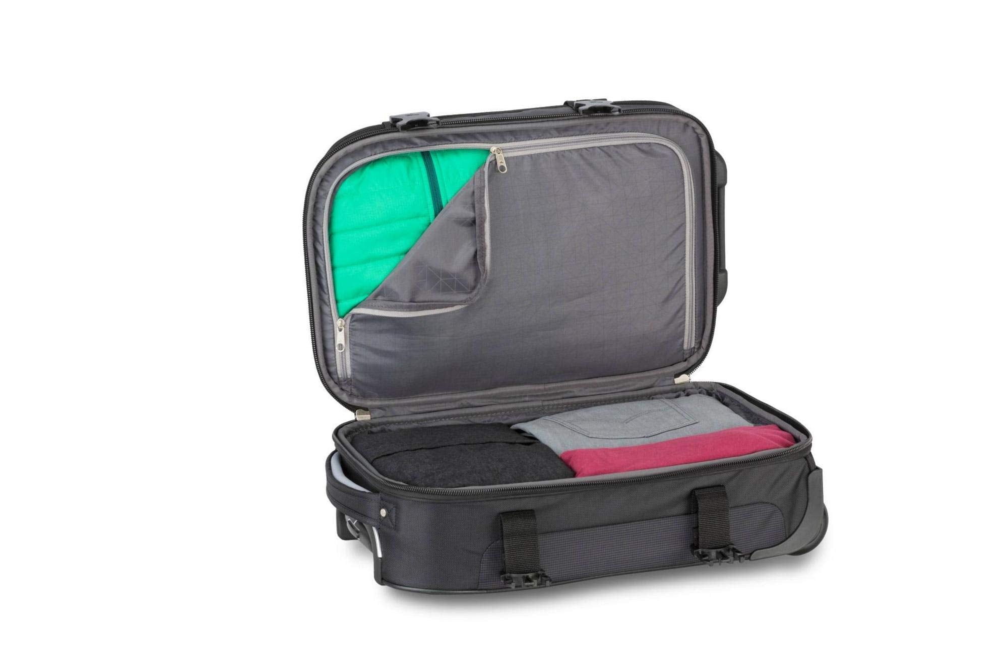 • Roll-up divider panel between front compartment and drop-bottom compartment
