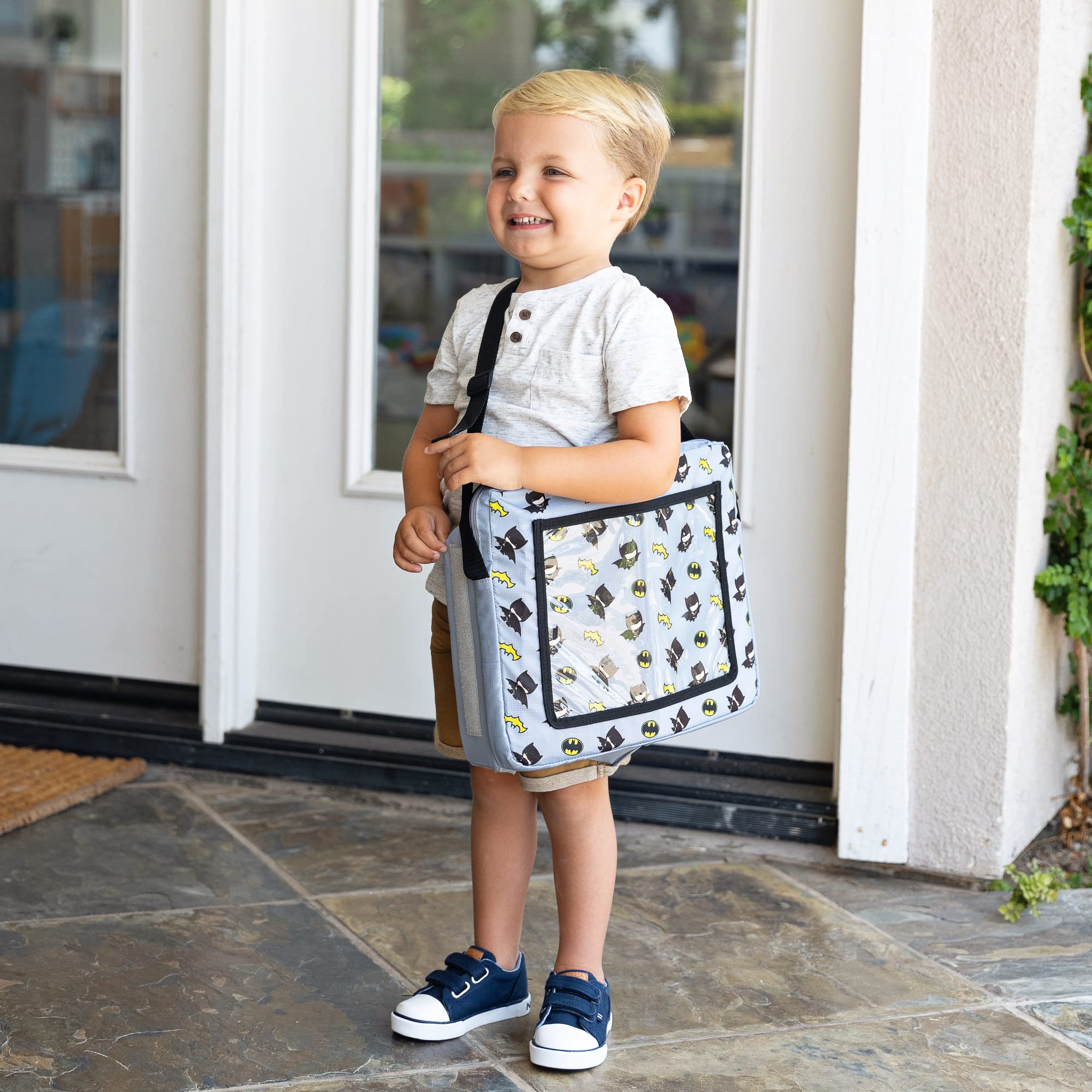 Batman saves the day on this fun J.L. Childress DC Comics 3-in-1 Travel Lap Tray and iPad Tablet Holder. This convenient travel tray will keep kids happy and entertained when on the go, providing a sturdy surface for schoolwork, virtual learning, coloring, snack time and more. The lap tray features raised edges to keep toys from rolling off and prevents spills. The tray has two mesh pockets that can hold snacks, crayons, toys, and more. The pockets can easily be detached and stored inside the large zippered compartment. A cup holder keeps drinks easy to reach and a buckle strap secures the tray around the child's waist. Turn the tray over and a full-size tablet holder will keep toddlers and kids peacefully entertained or conveniently display a virtual classroom. The tablet holder fits all sizes of I pads and tablets, and can be used in the car, on an airplane or in a stroller. The J.L. Childress DC Comics Batman 3-in-1 Travel Lap Tray and iPad Tablet Holder can also be used as a travel tote bag! Children love carrying their own, special bag and the large zippered compartment holds coloring books, worksheets, crayons and more. The shoulder strap is fully adjustable. Made out of durable, wipe-clean materials, the J.L. Childress DC Comics Batman 3-in-1 Travel Lap Tray and iPad Tablet Holder is sure to become your favorite travel product for kids! Folds in half for compact storage.