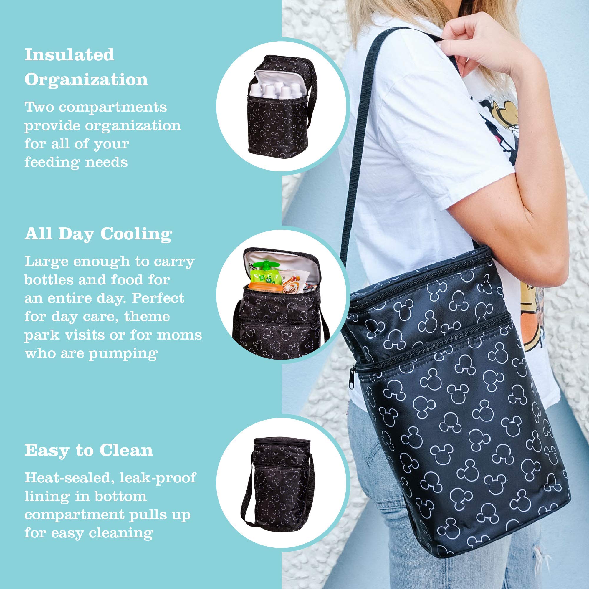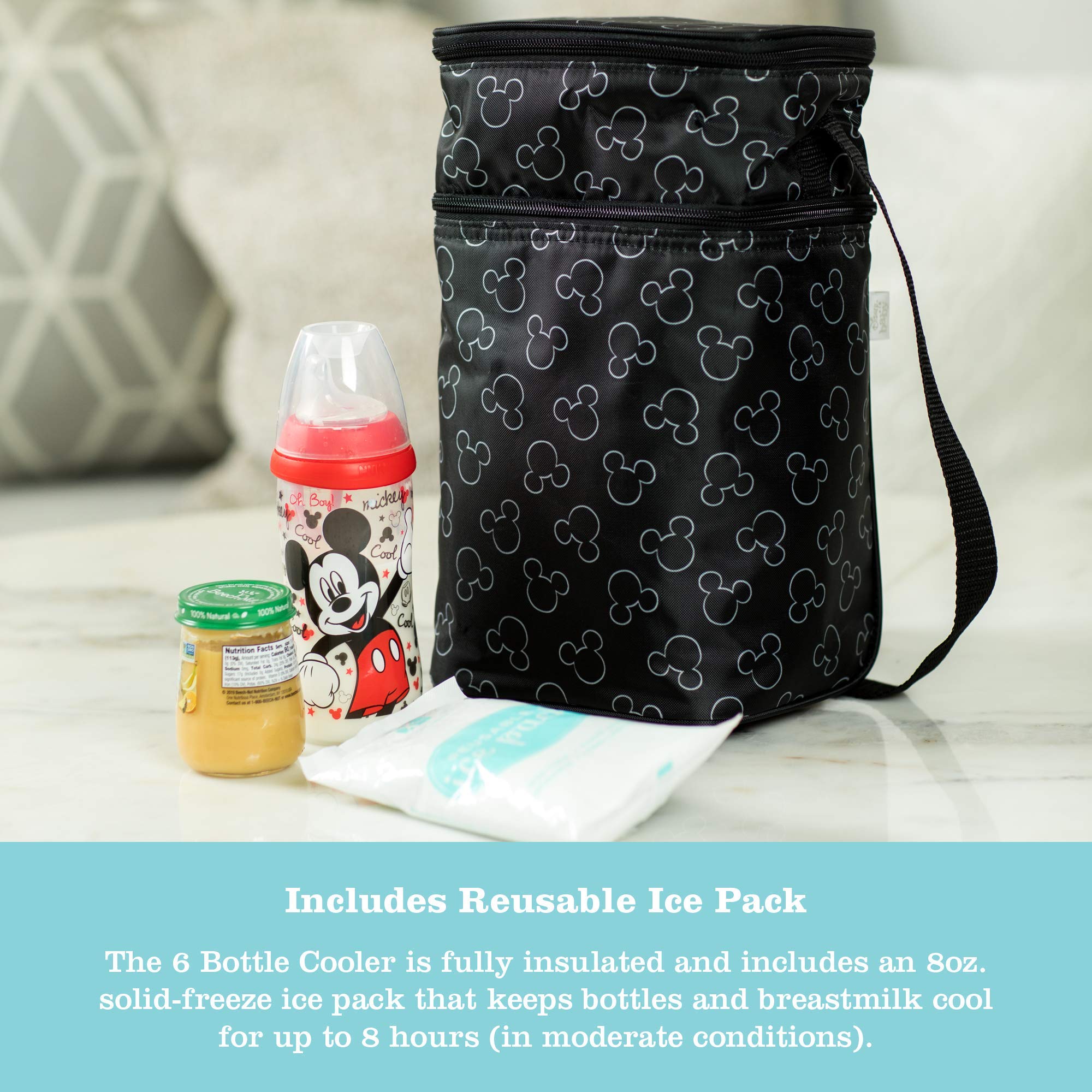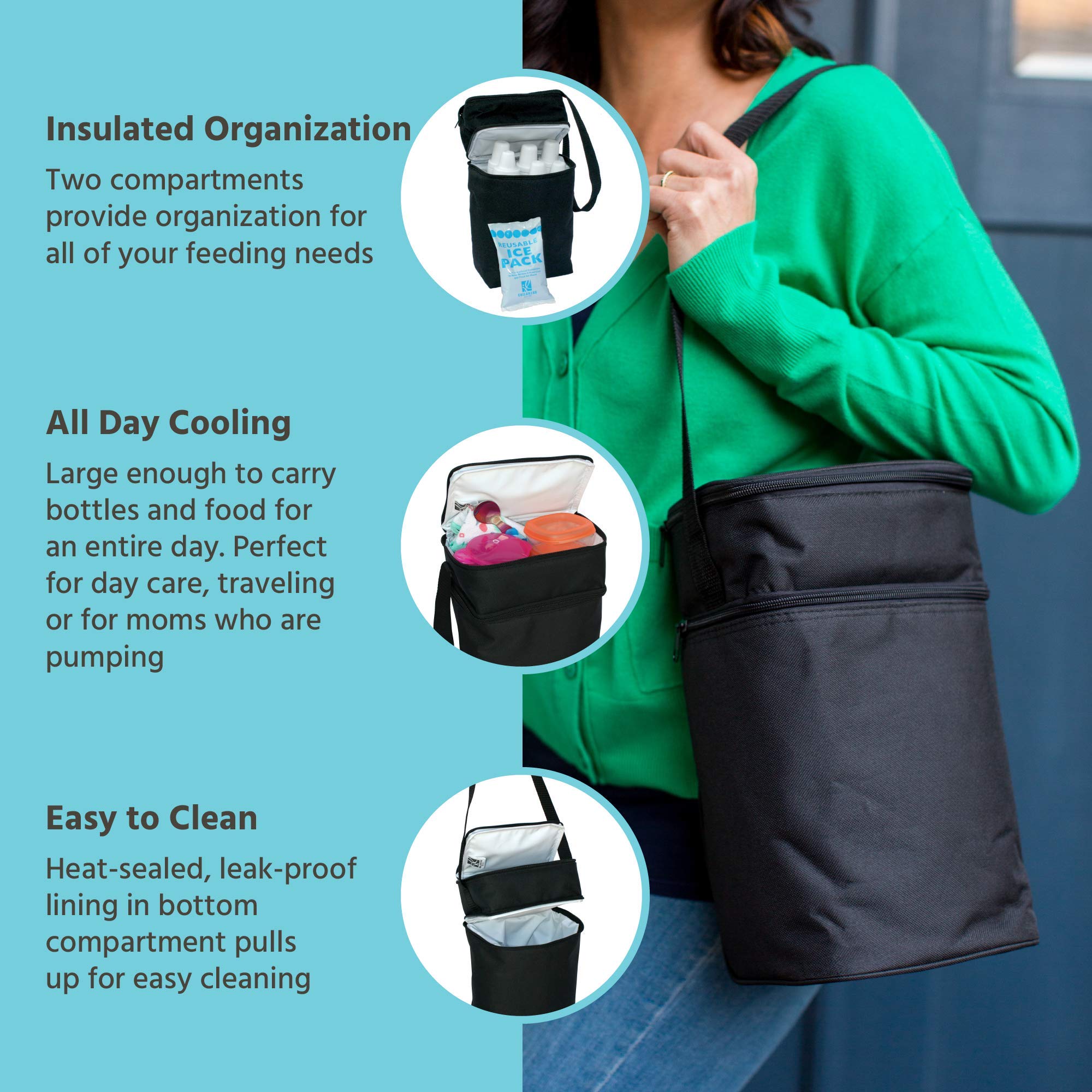 Color:Black  The fully insulated 6 Bottle Cooler is perfect for a day's supply of baby or toddler's nutritional needs. The 6 Bottle Cooler lining is leak-proof and PVC, lead and phthalate free! This tote features 2 seperate, insulated zippered compartments for easy organization. The bottom compartment holds up to 6 standard bottles, or 3 bottles and Tupperware or small cereal box. The interior lining of the bottom compartment pulls up for easy cleaning to avoid odors or mildew. The top compartment is perfectly sized to hold 3 food jars or food pouches, utensils, and bibs. Shoulder strap for convenient carrying. Includes reusable ice pack. From the Manufacturer Perfect for a day's outing. The fully insulated 6 Bottle Cooler is perfect for a full day's supply of baby's feeding needs. Features leak-proof lining that is PVC, lead and phthalate free. Lining pulls up for easy cleaning to prevent odors or mildew. Holds 6 standard bottles, or 3 bottles and Tupperware or small cereal box. Top compartment holds 3 food jars, utensils, and bibs. Includes reusable ice pack.