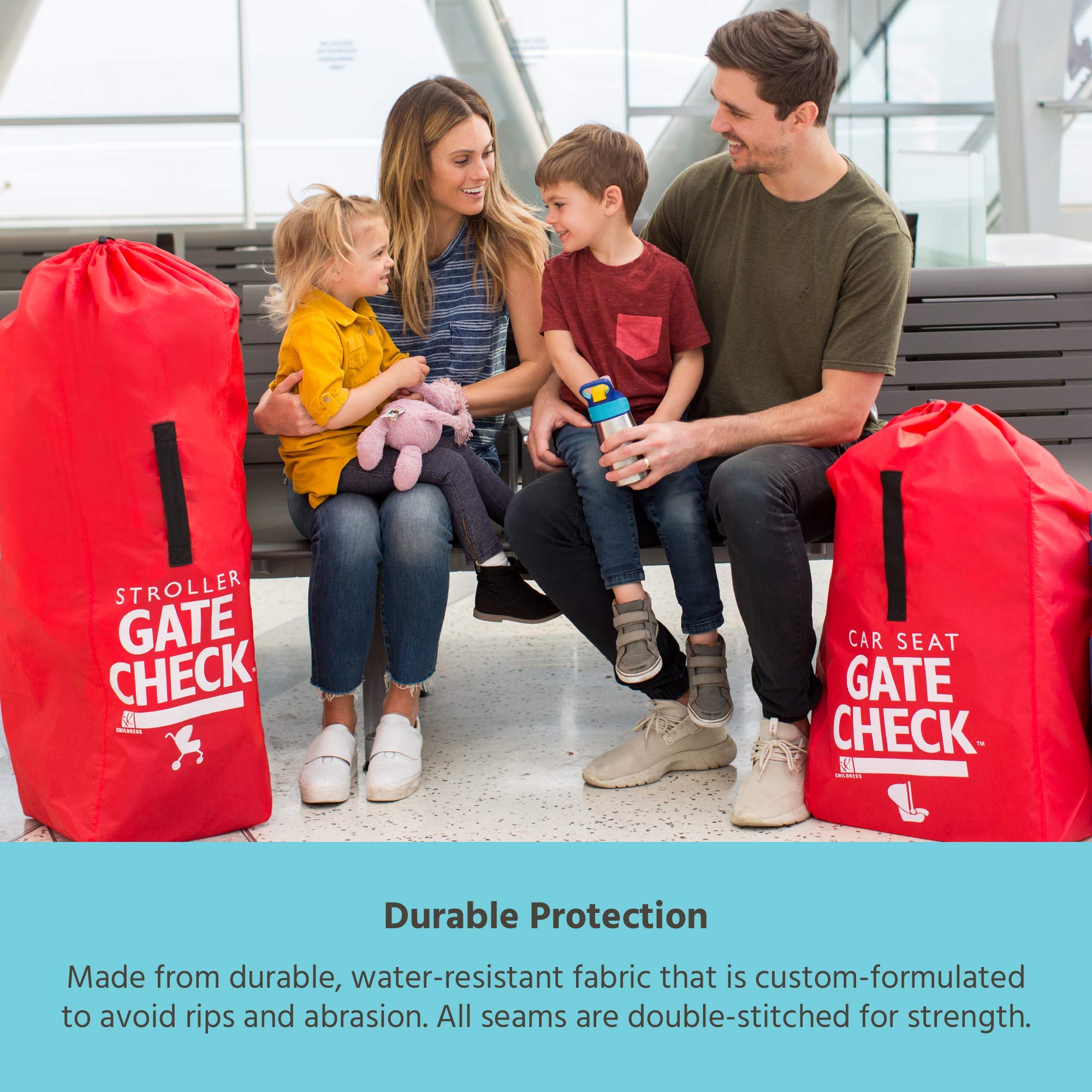 Color:Red Use this handy, compact travel bag when gate-checking a car seat, booster seat or infant carrier to protect it from dirt and germs. The bright red color and NEW large, stroller GATE CHECK graphic easily identify your item for return to gate. Made of a durable yet lightweight, water-resistant material for maximum protection. Fits and covers most car seats easily with draw-string closure and adjustable lock. Stuffs quickly into NEW attached spandex pouch for traveling convenience. Compact to fit in travel bags. Features a webbing handle for easy lifting, reinforced seams for strength and a personal identification box. Not recommended for baggage check. Also use as a storage bag. Airline approved and recommended by baggage handles around the world. Trust J.L. Childress, the original inventor of the stroller and car seat Gate Check Bags and the 1 leading brand in car seat and stroller travel bags! Around the world or around the block, Travel Happy with J.L. Childress! Wipe clean with mild soap and warm water