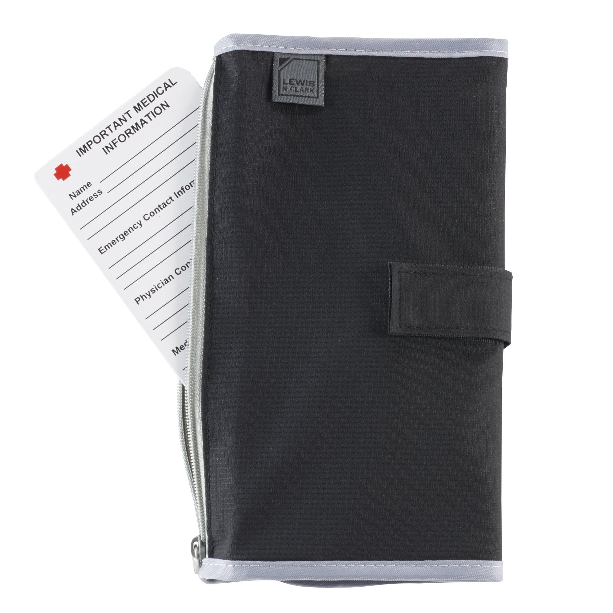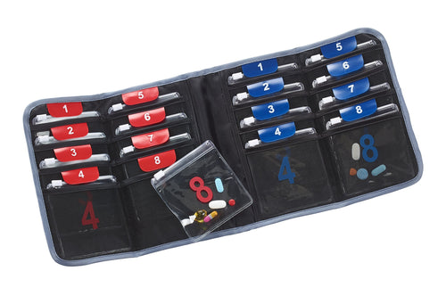 The Lewis N. Clark AM/PM pill organizer can be used whether youre travelingor you simply want an easy way to carry around your medications with you. Itis designed with sixteen clear pouches, which can be individually taken out asneeded. With both blue tabs and red tabs as well as numbers, you can easilykeep track of which pills youve taken throughout the day and night withoutaccidentally missing a dose, which is especially important if youre takingprescription medications. Its also good for every-day pills intended forupset stomach, headaches and migraines, colds, allergies, and other over-the-counter remedies. Daily supplements and vitamins can also be easily organized.Instead of bringing each individual bottle with you, this sleek foldingmedication holder can easily fit into your purse, briefcase, carry-on bag,backpack, suitcase, etc. and youll still have room for your other belongings.The polyester material ensures that youll be adding virtually no weight toyour bag. The Velcro closure keeps contents secure and even adjusts toaccommodate the number of pills youre carrying. The exterior zippered pocketholds the medical reference card, but its also good for doctorsprescriptions, receipts, and other papers. Its subdued black color also blendsin easily with your belongings so others wont even realize that it is a pillorganizer. In case a medical emergency arises and you need assistance, themedical reference card includes spaces for your name, emergency contactinformation, physician contact information, medical conditions, allergies, andcurrent medications, which can be very important when youre not in a localarea. Instead of lugging around individual boxes or bottles of pills on yourtravels, or trying to keep track of which medications youve taken throughoutthe day, save space and weight in your bag - as well as time - by using thisportable pill organizer.