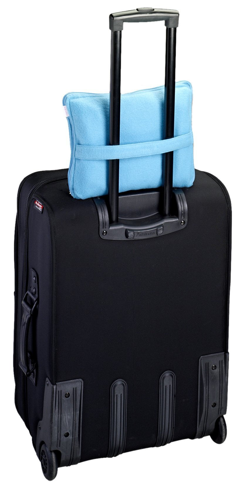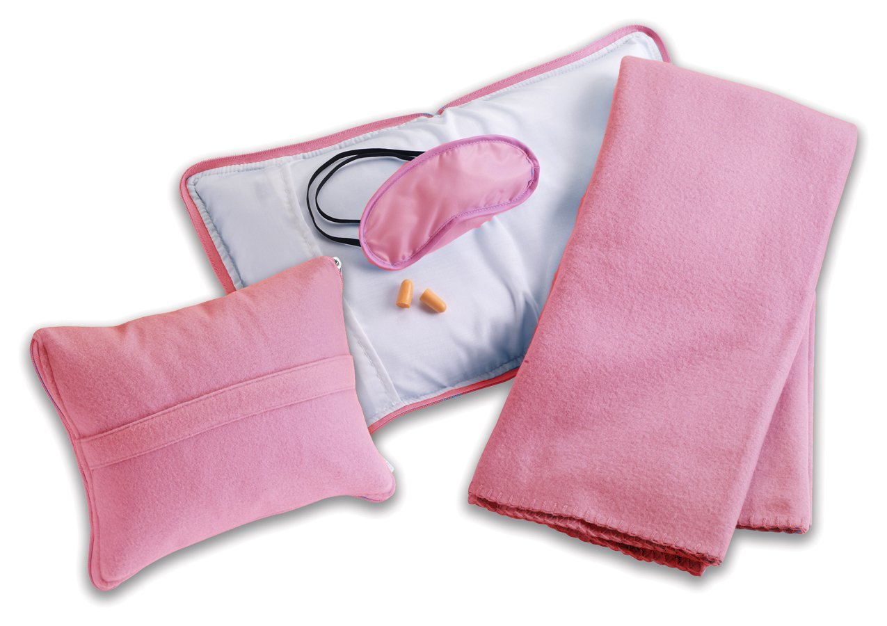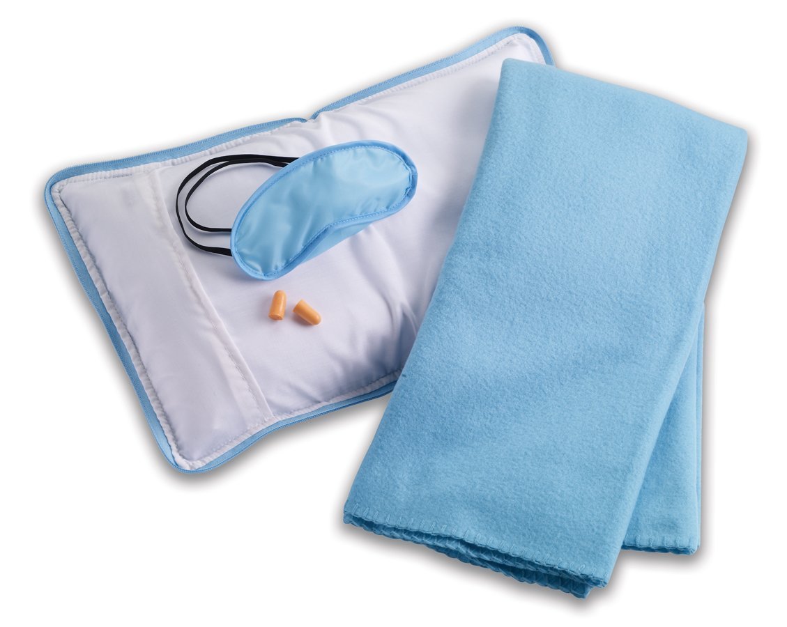 ULTIMATE COMFORT SET - 7199 Its the ultimate let-go, and you can take it withyou. Indulge in soft comfort wherever you go with this comfy, compact set.Includes a full-size inflatable head pillow (18 in x 3 in x 11 in inflated),38 in x 50 in fleece blanket, eye mask with elastic straps and one pair offoam ear plugs. When deflated, the pillow cleverly converts to a compact 11.5in x 2.5 in x 9.5 in zippered carry case for convenient comfort, and includesa strap for attachment to luggage handles. Azul blue, green tea or pink.COLOR: Green, Blue, Pink Indulge in soft comfort wherever you may travel withthis handy comfort set, that includes 18" inflatable pillow, fleece blanket,eyemask, and earplugs.