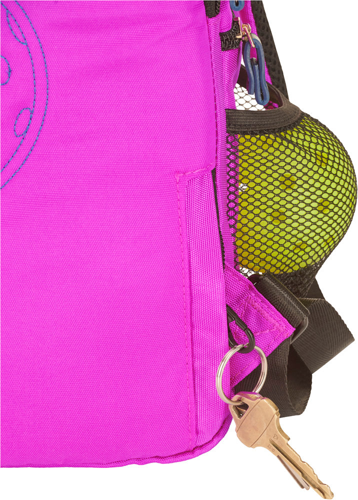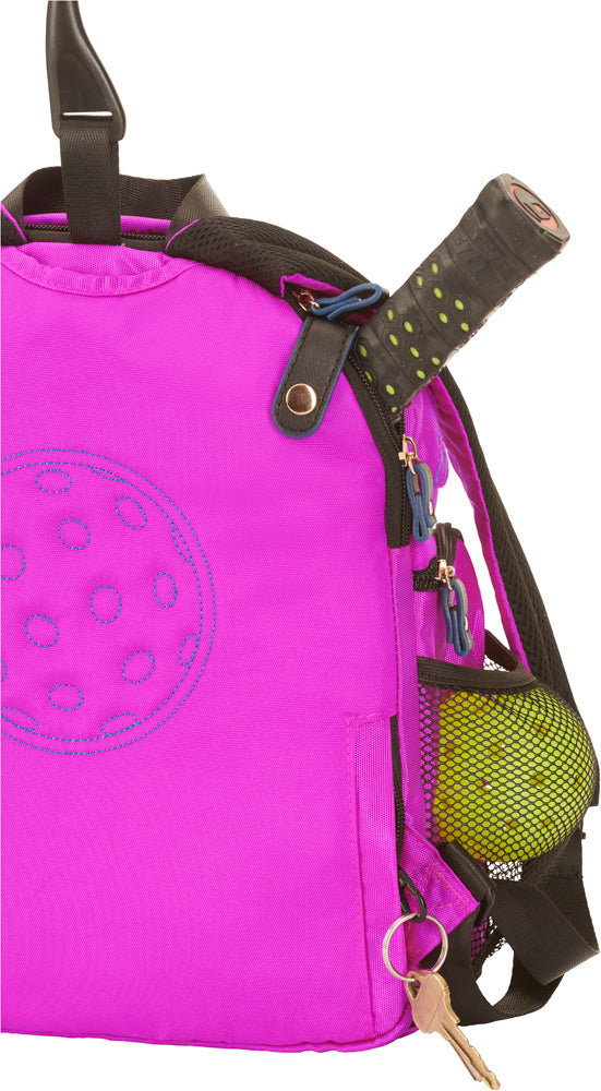 Our personalizable Sankaty Backpack will not disappoint! The perfect size backpack for pickleball lots of storage but doesnt look like a school or work bag. Do not miss the embroidered pickleball on the back and the cast pickleball zipper pulls! Crafted of durable, water-resistant nylon and loads of functionality. The front pocket has a rain cover to keep your accessories dry, and room for towels, jackets, extra balls and more. Back pocket holds two paddles, with a snap to keep the handle in place.