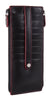 - Features: 2 exterior zip pockets, rear ID slot with thumb glide, and 8 card slots with strap to securely holds cards in place. RFID protection in entire wallet when closed.