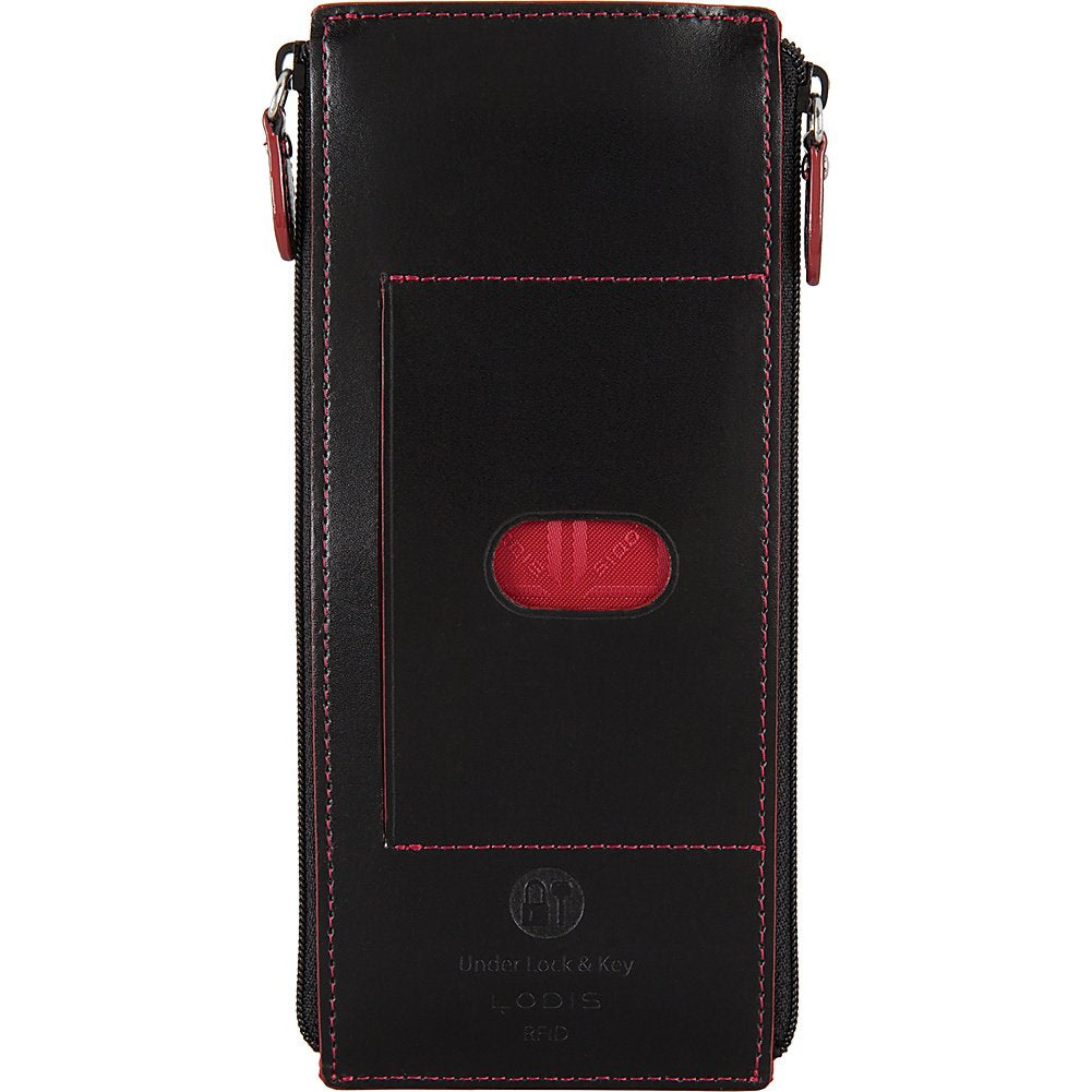 Quite simplychic, timeless beauty, refined and elegant. Smooth grain Italian leather, contrasting trim, and interiors featuring new Lodis organizational bag-moji icons and Lodis Under Lock and Key (trademark pending) RFID protection. Two zips are better than one. Our signature credit card stacker just got better with more space for your cards and a second zipper pocket for extra organization of bills and receipts. Features: 2 exterior zip pockets, rear ID slot with thumb glide, and 8 card slots with strap to securely holds cards in place. RFID protection in entire wallet when closed. One year warranty against manufacturing defects.