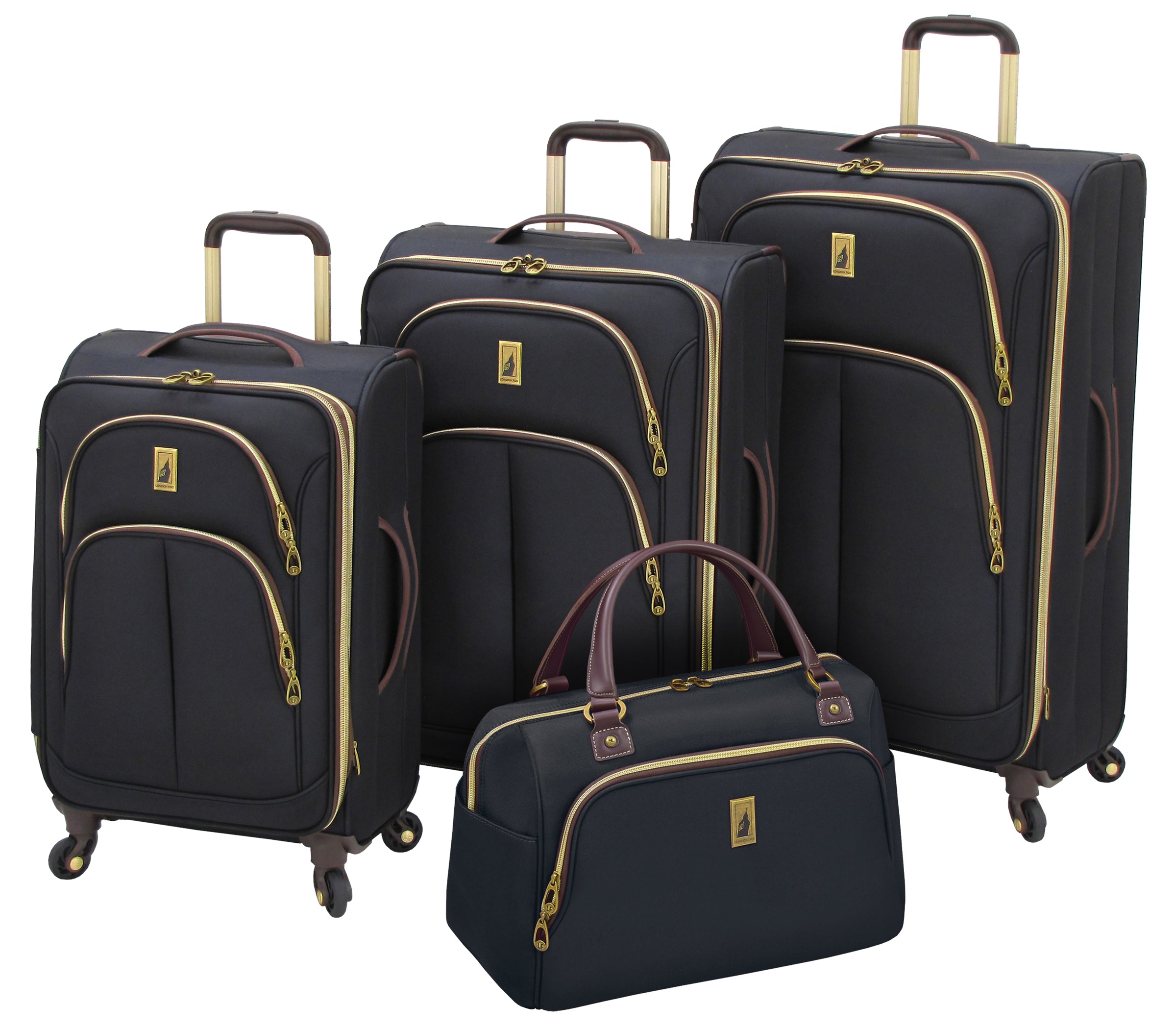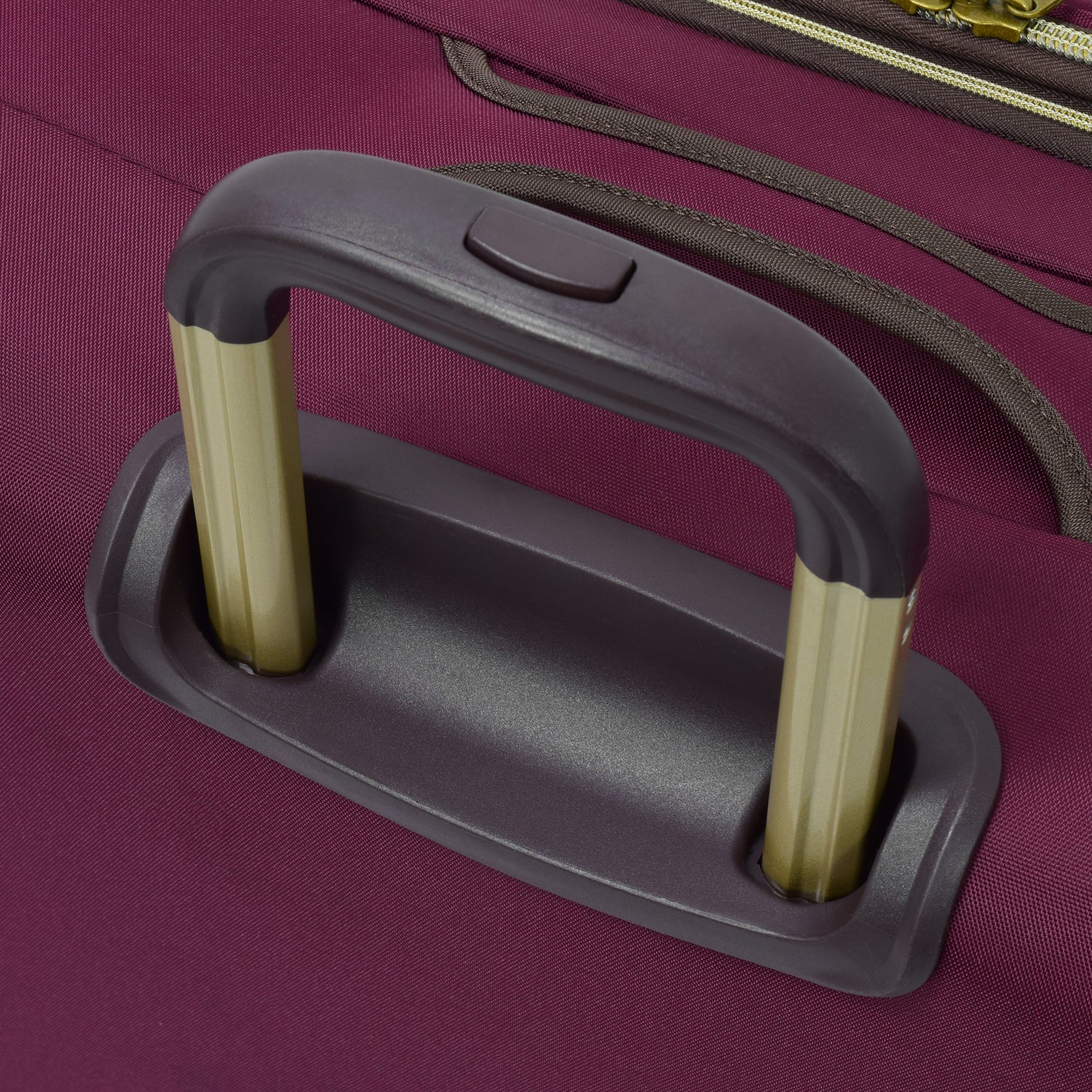 Durable Micro Weave poly-ballistic material. Hyperlight chassis with grid base for superior strength. Trolly has aluminum channel tubes for added strenght. Ergonomic comfort grip locking trolley handle. Low profile 360 degree multi-directional wheels mounted to grid base for stability. Antique brass metallic hardware and zippers. Convenient top side and botto, carry handles. Full London Fog signature lining, Interior has integrated show pockets an d a zippered mesh pocket on lid. Spinner uprights expand 2" for additonal packing capacity, Indutrial sef-repairing nylon #10 zippers. Dual skid runners protect fabric and trolly tubes.