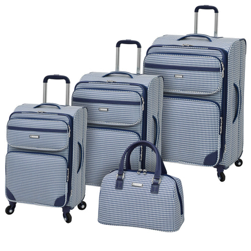 This iconic London Fog Hampton luggage collection is a beautiful travel set to accompany you on your next trip. The woven Jacquard blue/white gingham checkered luggage is hyper-light and includes structural features such as a chassis with grid base for superior durability and strength. The low profile 360 degree multi-directional wheels mounted to base for stability and ease while traveling with your luggage. The grip handle is comfortable and has many locking positions that allow you to feel comfort and ease while traveling. The case has the ability to expand 2" which allows for extra packing capacity. Top and side grab handles on the exterior for convenience.
