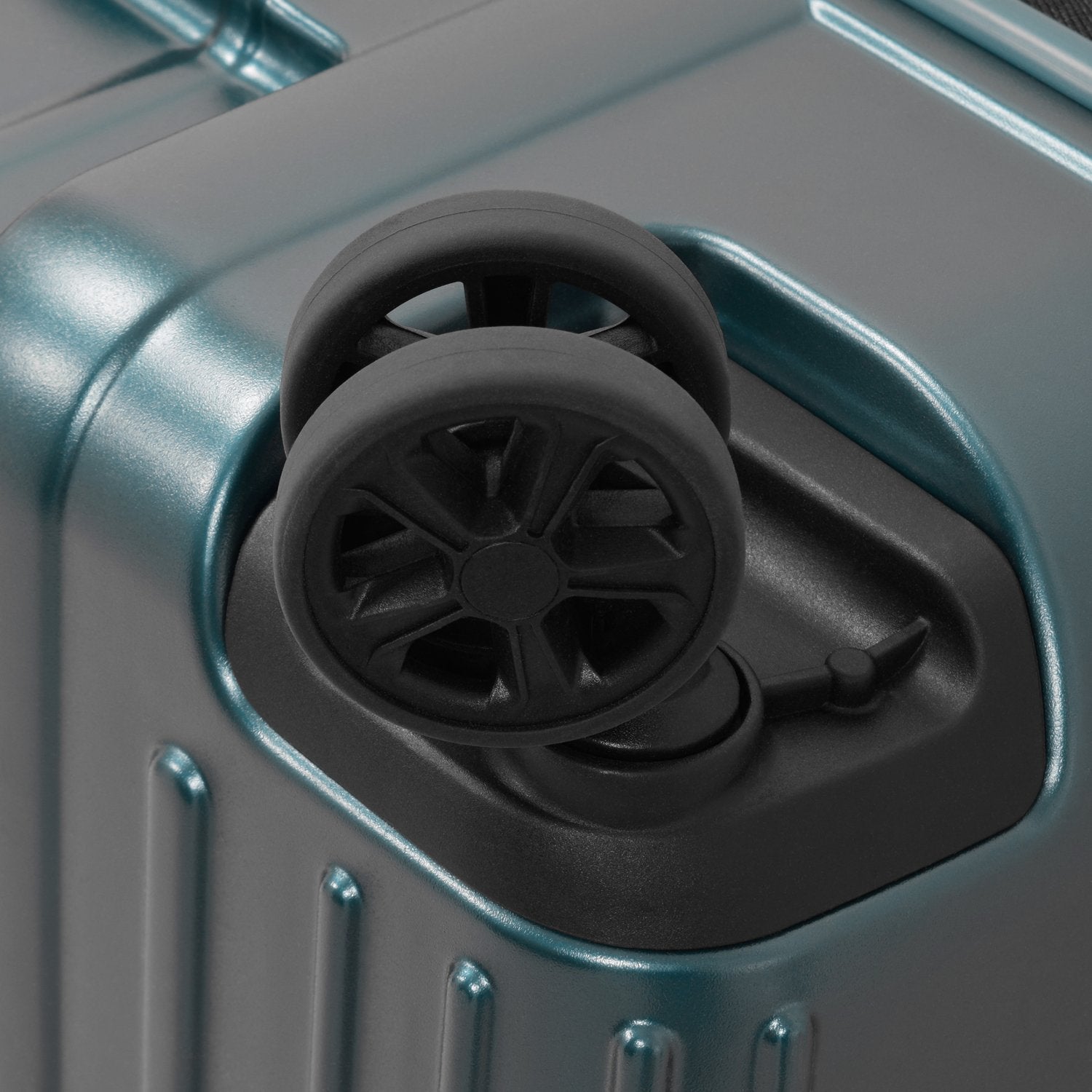 • Locking push button handle system with aluminum channels for added strength. Deluxe 8-wheel multi-directional 360 degree spin technology.