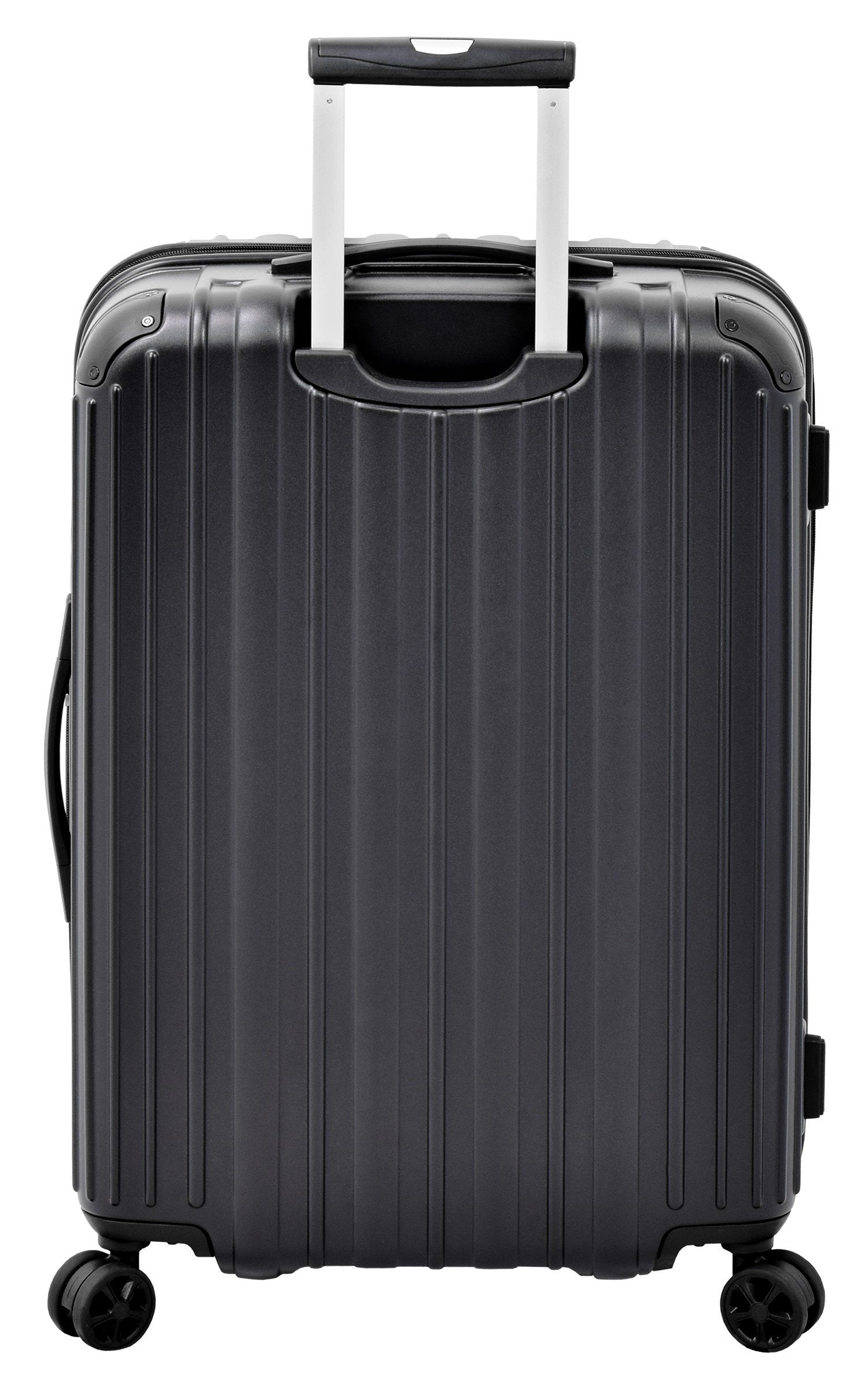 Locking push button handle system with aluminum channels for added strength. Deluxe 8-wheel multi-directional 360 degree spin technology. TSA approved locks, flush mounted for strength. Side feet and corner guards for extra protection. Interior has zippered dividers and tie down straps. Expands 2" for additional packing capacity. Full iconic London Fog plaid lining interior as well as custom London Fog hardware. Limited lifetime warranty.