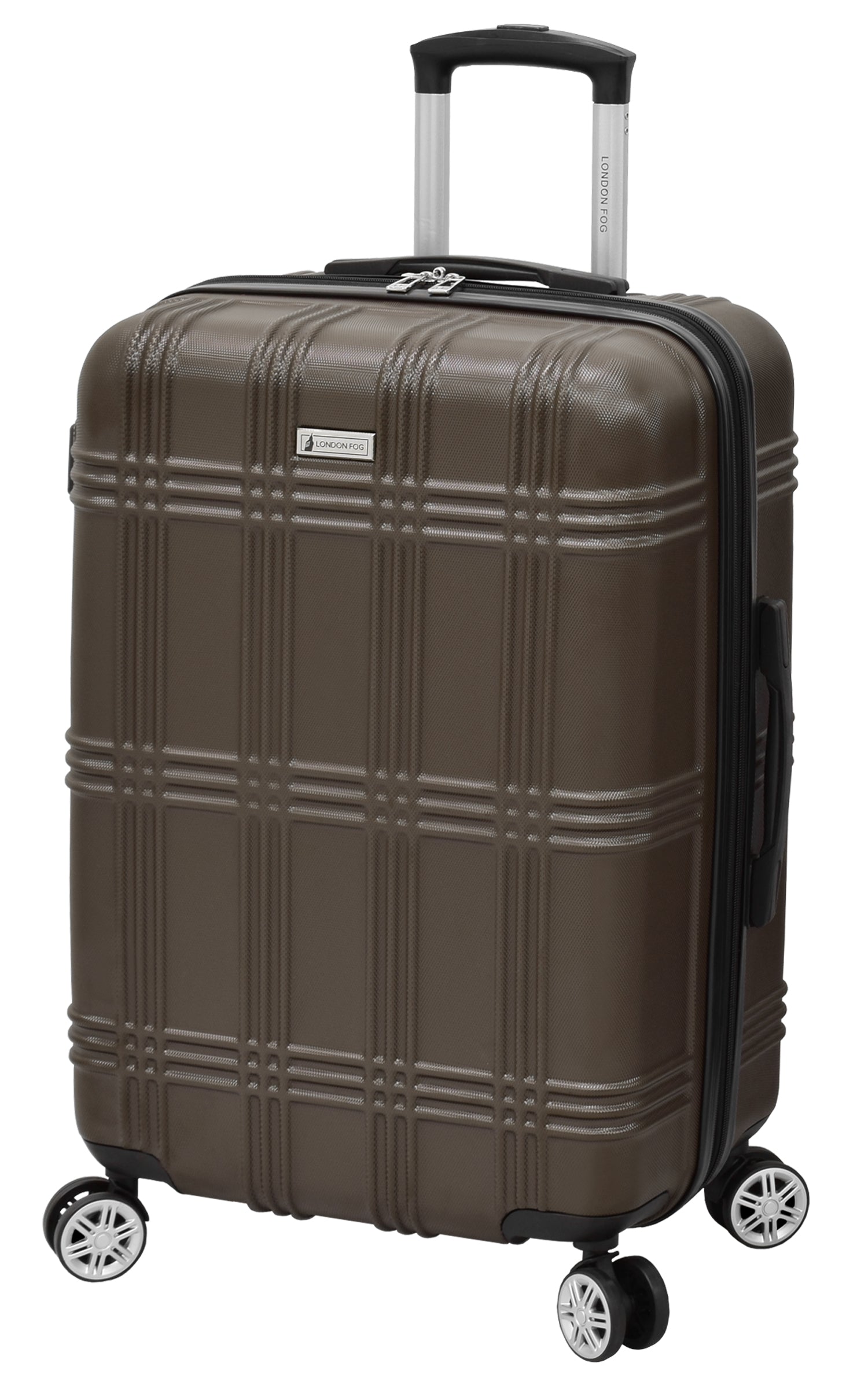 Durable Lightweight polycarbonate composite. Locking push button handle system with channels for added strength. Deluxe multi directional 360 spin technology 8-wheel system. Full London Fog plaid linig. Interior has zippered divider and elastic tie down straps. Spinner uprights expand fpr additional packing capacity. Convenient top and side carry handles for easy lifting. Side feet for extra protection. Self repairing nylon zippers. Custom London Fog hardware.