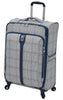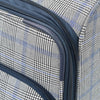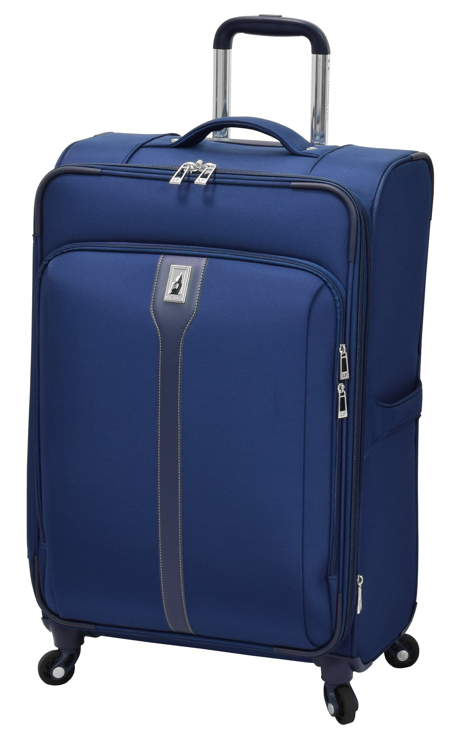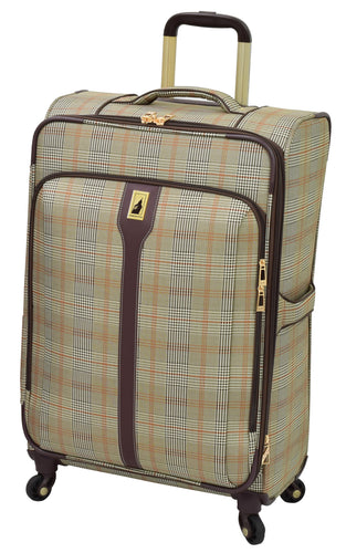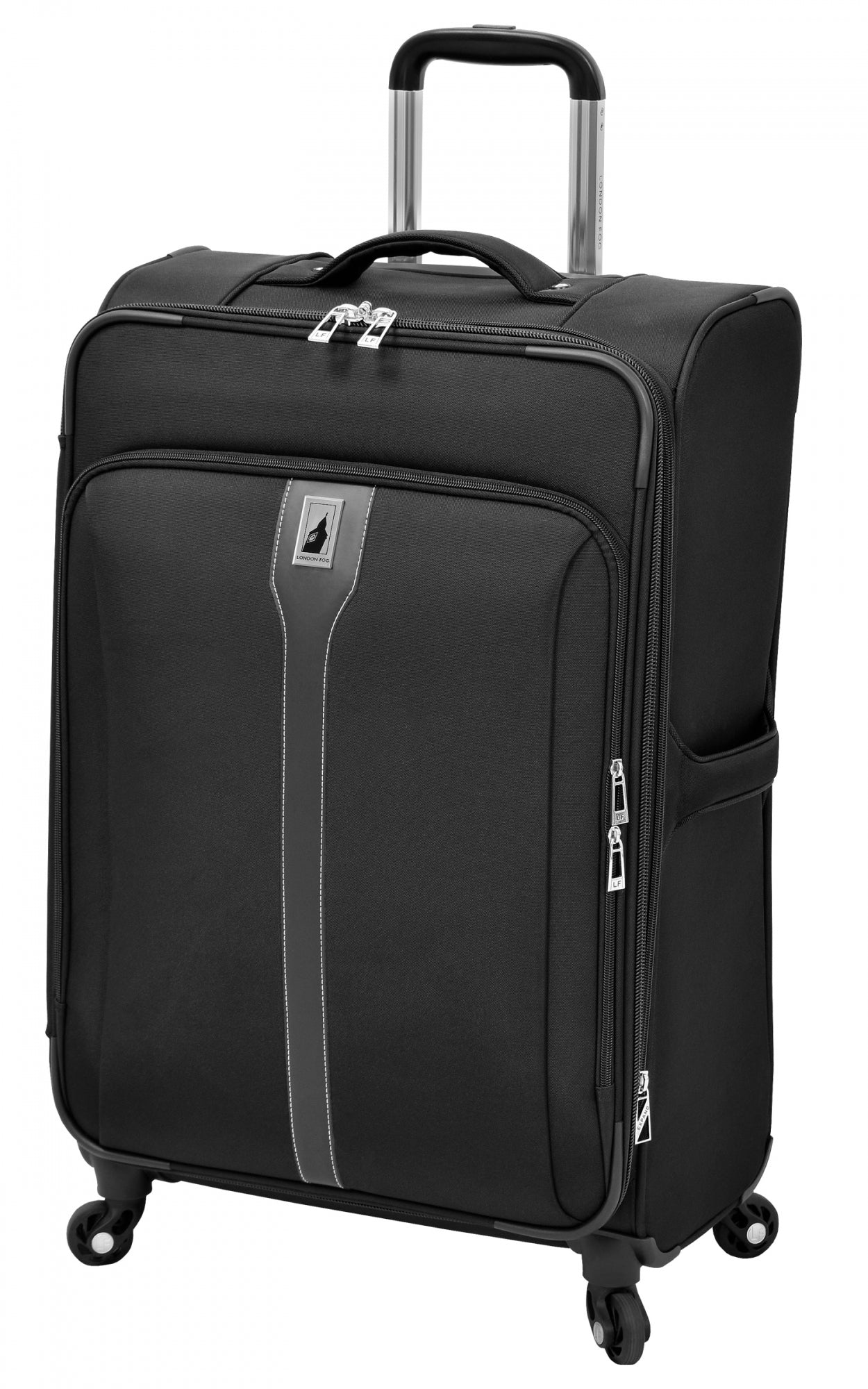 Lightweight woven plaid or micro-balistic polyeser material with hyperlight chassis with grid base for superior support, trolley has aluminum channel tubes for added strength and ergonomic comfort grip locking trolley handle, low profile 360 multi-directional wheels mounted to grid base for stability with interior has integrated shoe pockets and a zippered mesh pocket on lid, spinner uprights expand 2" for additional packing capacity and has industrial self reapiring nylon zippers, skid guards protect fabric and trolley tubes and has custom london fog hardware