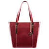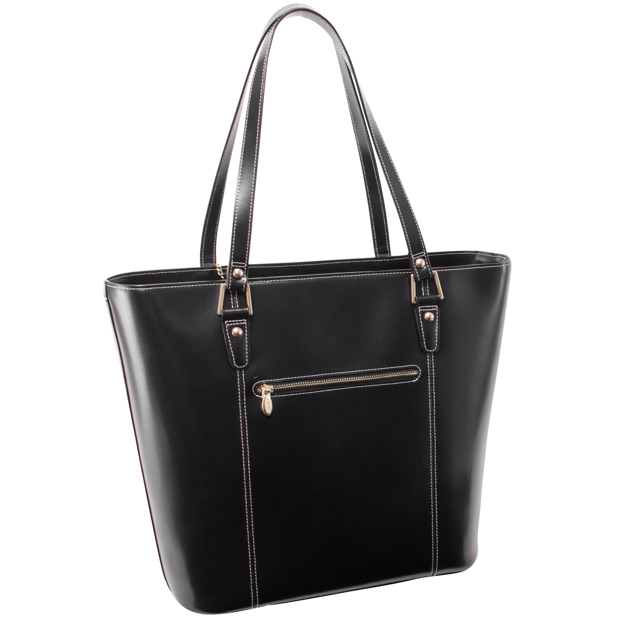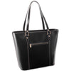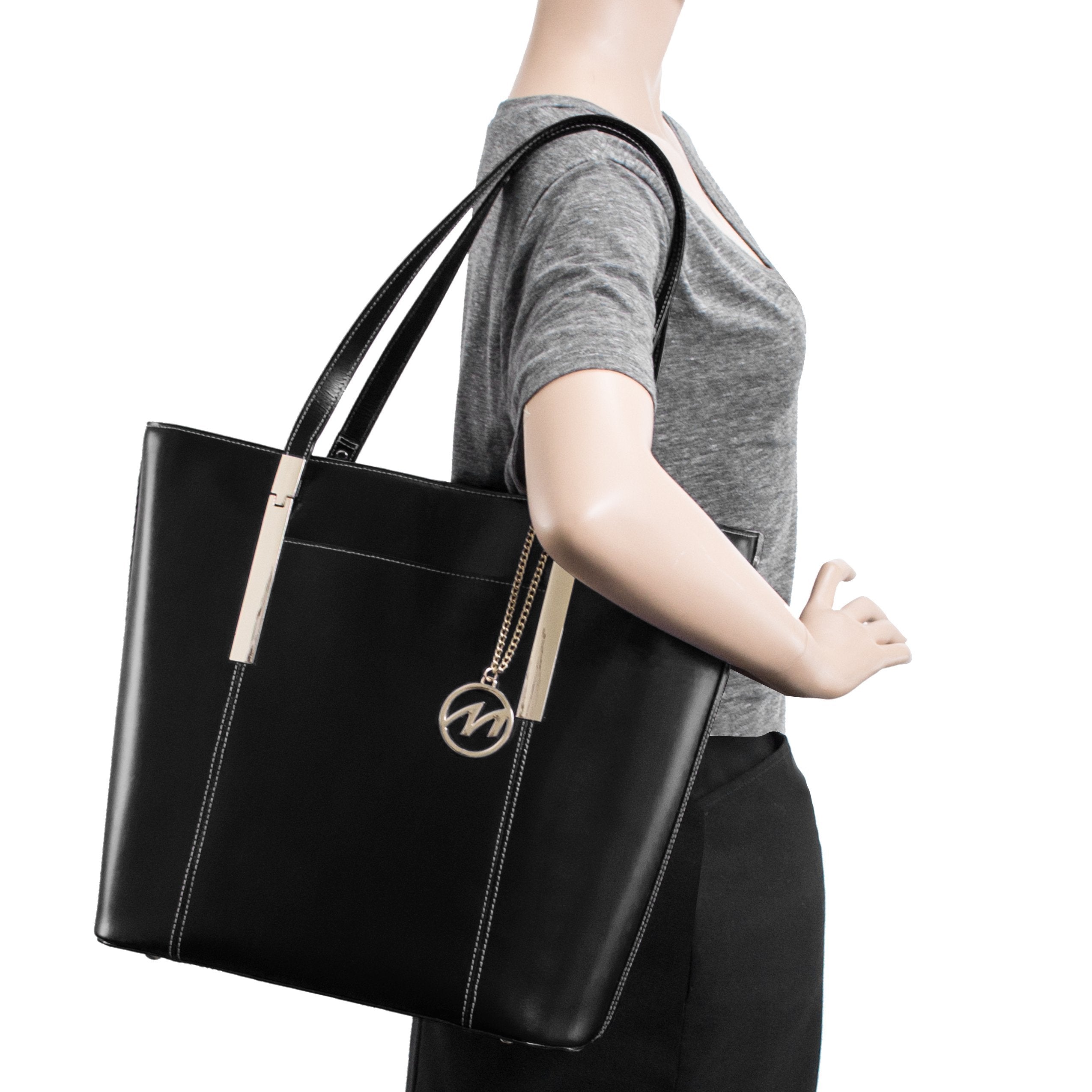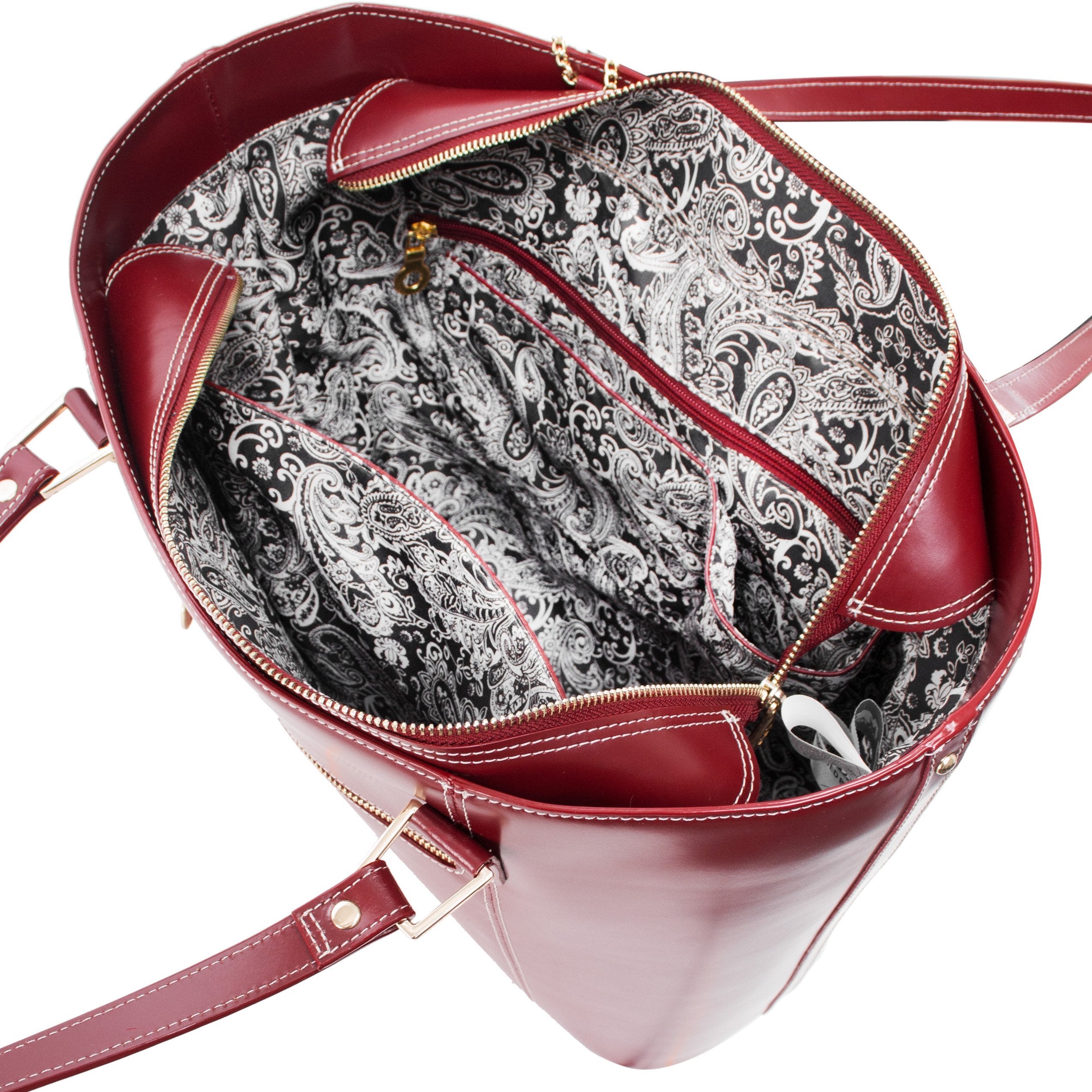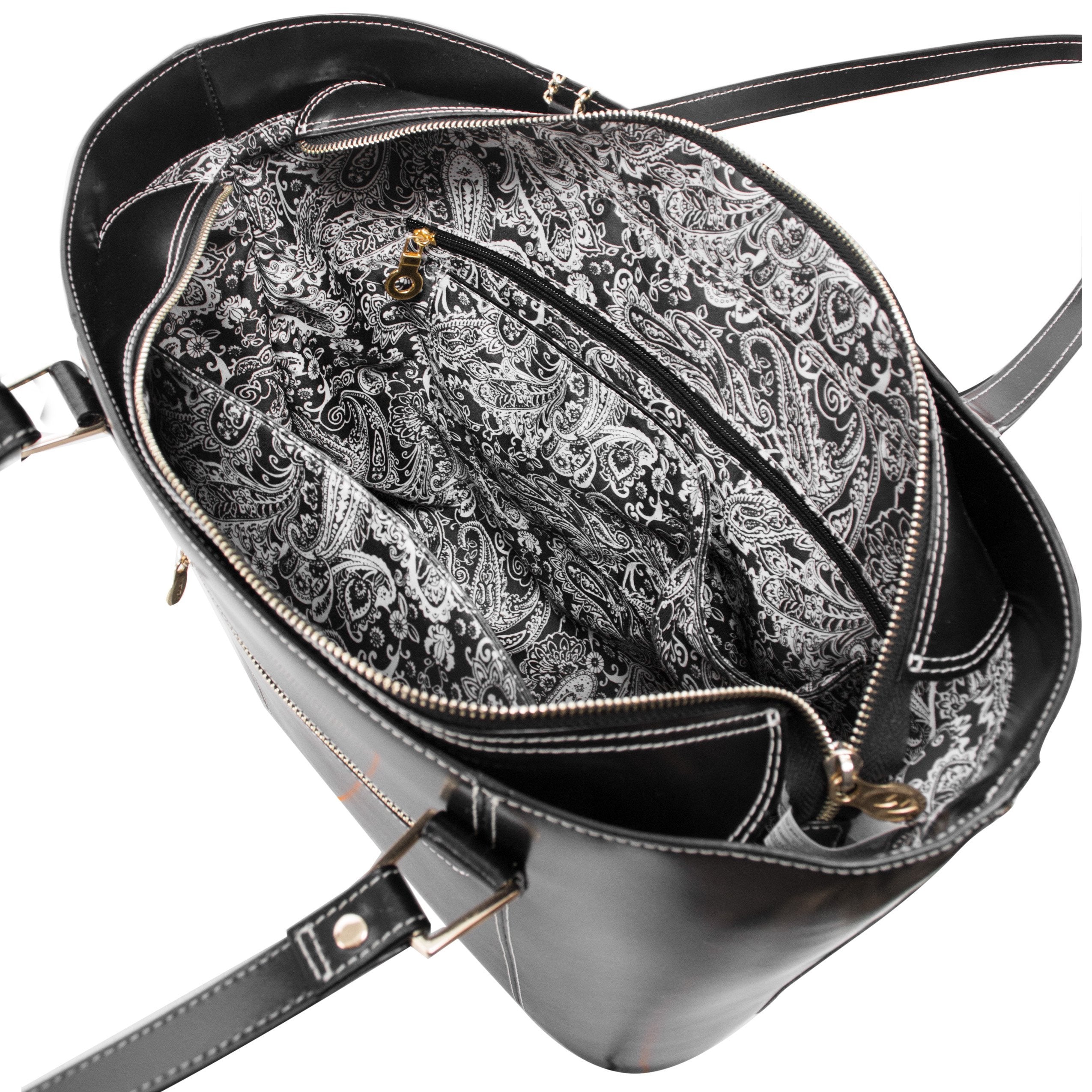 Tote features elegant gold key chain. Easy Access Exterior back pocket. One pocket perfect for tablets. Secure zipper pocket. Two Leather reinforced accesory Slip pockets.