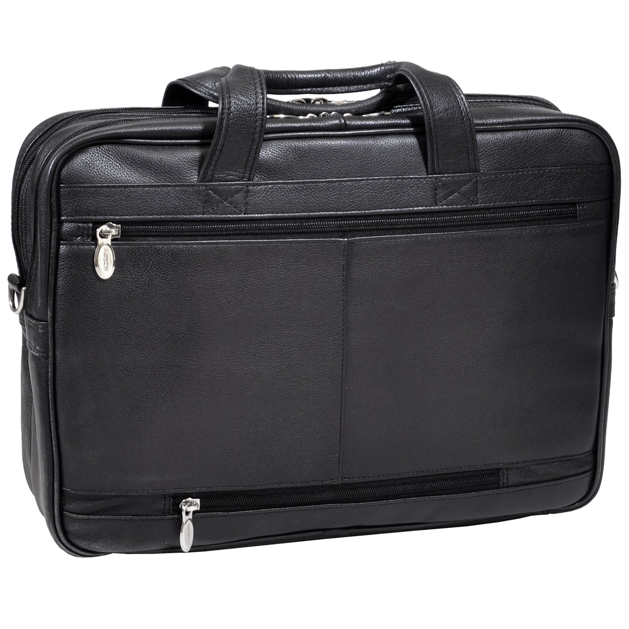 Front pocket with dual magnetic clasps features two accessory pockets and file section for documents and accessories. Two main zipper compartments. Front zipper compartment features file divider for documents. Back zipper compartment features an interior organizer for pens, business cards and small devices. Back zipper compartment also features built-in padded laptop sleeve that fits and protects most laptops up to 15" in screen size.
