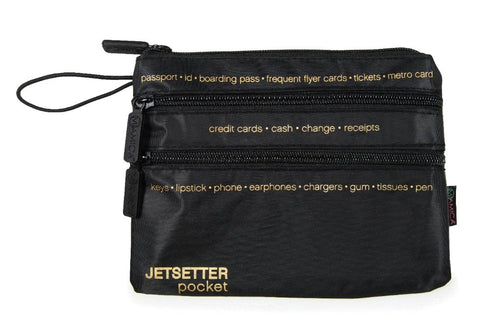 Traveling has never been easier with our 3-zip black & gold pouch. Separate pockets will keep your boarding pass, credit cards, phone and lipstick safe and within reach at all times!