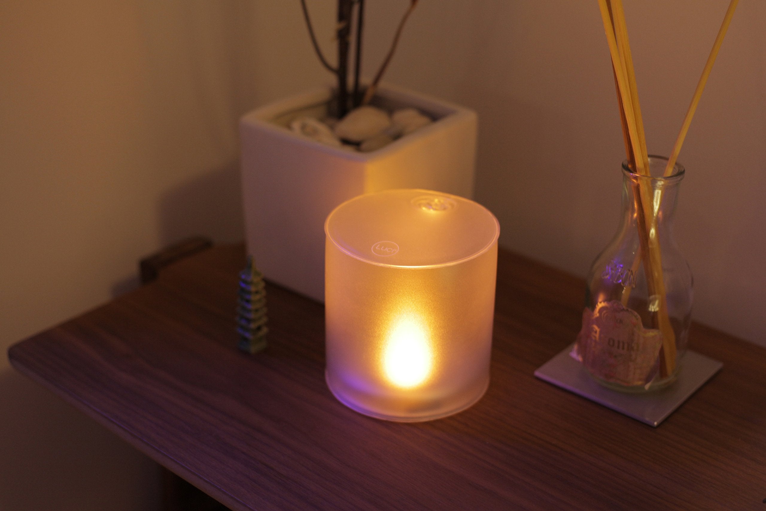 • With a frosted finish and comforting flameless flicker, Luci Candle adds a touch of zen to your patio, yoga studio or dinner table.