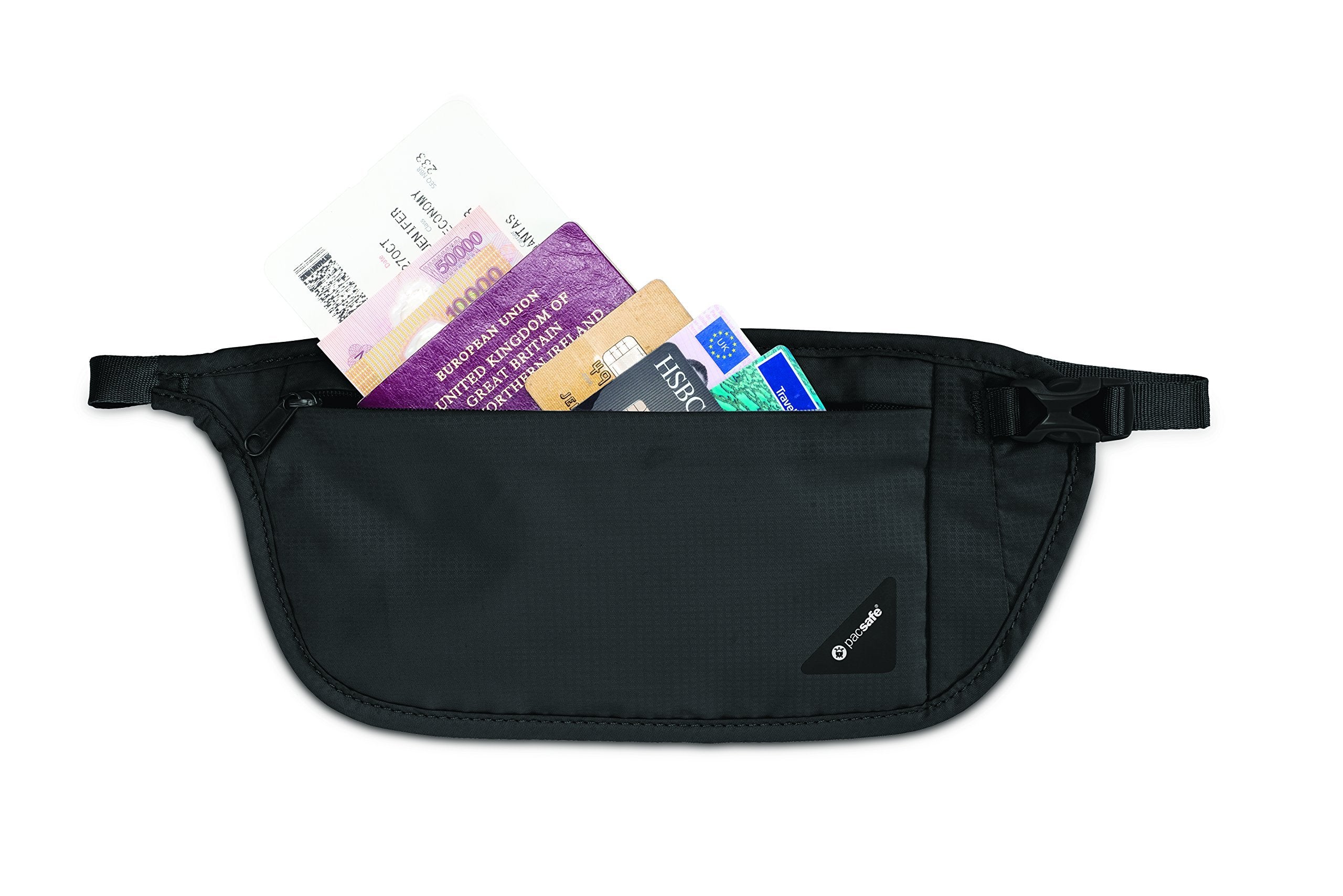 Keep cash, cards, keys, and travel documents safe, concealed and close at handwith the Coversafe V100 RFID blocking waist wallet. The breathable materialand soft webbing straps add a level of comfort so it can be worn subtly underclothing. The RFID blocking material built into the Coversafe V100 preventsyour data (such as from e-passports, credit cards, and key cards) from fallinginto the wrong hands. Compact, but roomy enough to fit a passport and othersmall daily valuables, the waist wallet has a zippered main compartment withpocket, and an adjustable waist strap (30 to 47 inches) with side releasebuckle. Measuring at 5 x 11 (HxW), it weighs just two ounces. Pacsafe keepstravelers one step ahead of the game by keeping their gear secure fromopportunistic thieves with a wide range of stylish adventure backpacks,leisure bags, urban bags, womens bags, and camera bags, as well as luggageand travel accessories.