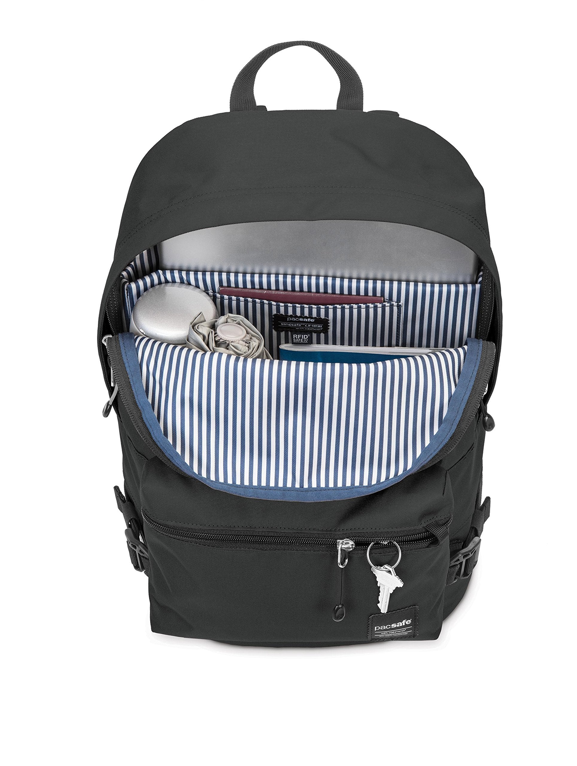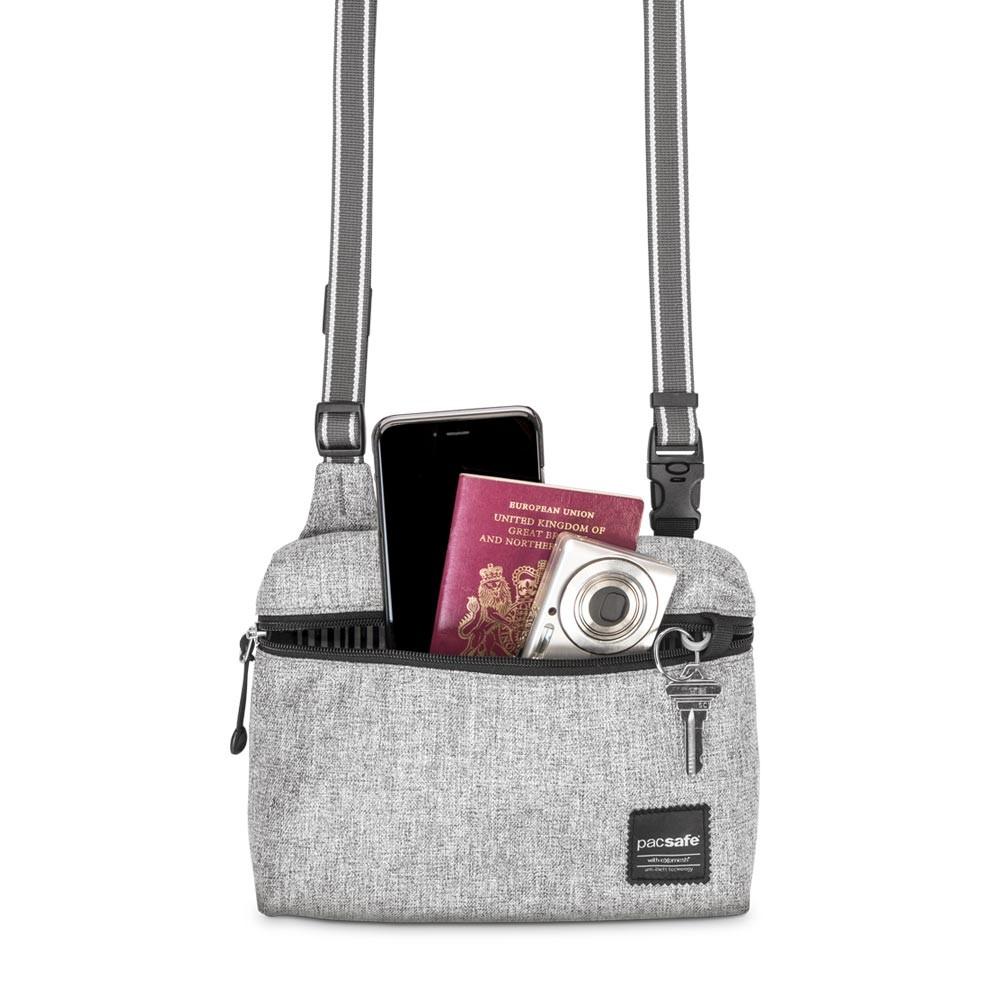 The Slingsafe LX400 from Pacsafe is the perfect two in one anti-theftbackpack for any city or travel inspired occasion, offering flexibility with adetachable front pocket. Simple and unstructured, the pack has a variety ofanti-theft features built into it to help keep belongings safe. The bagsfabric is embedded with eXomesh Slashguard, a stainless steel wire mesh thatprotects your gear from a quick slash-and-run theft. The Turn and LockSecurity Hook allows you to secure the bag to a fixture for added security,and the ultra-strong wire-imbedded Dyneema webbing straps help prevent cut-and-run theft. The RFIDsafe blocking pocket helps prevent your data (such asfrom e-passports, credit cards, and key cards) from falling into the wronghands, while the smart zipper security makes it difficult for pickpockets toquickly access the front and main pockets. The detachable front pocket comeswith a removable shoulder strap, turning the front pocket into a smallcrossbody bag. Weighing just 21 ounces, the Slingsafe LX400 has a laptopsleeve compatible for an 15-inch laptop, and leaves plenty of room to organizeyour daily essentials. Pacsafe is all about secure mobility. With a wide rangeof stylish adventure backpacks, everyday bags, womens bags, camera bags,luggage, and travel accessories, Pacsafe lets you unpack the stress ofprotecting your gear, and instead, pack peace of mind.