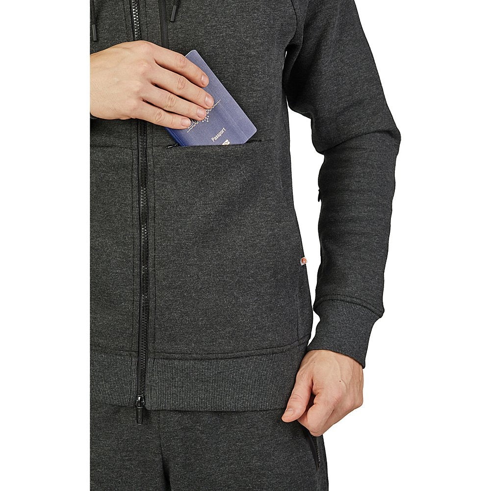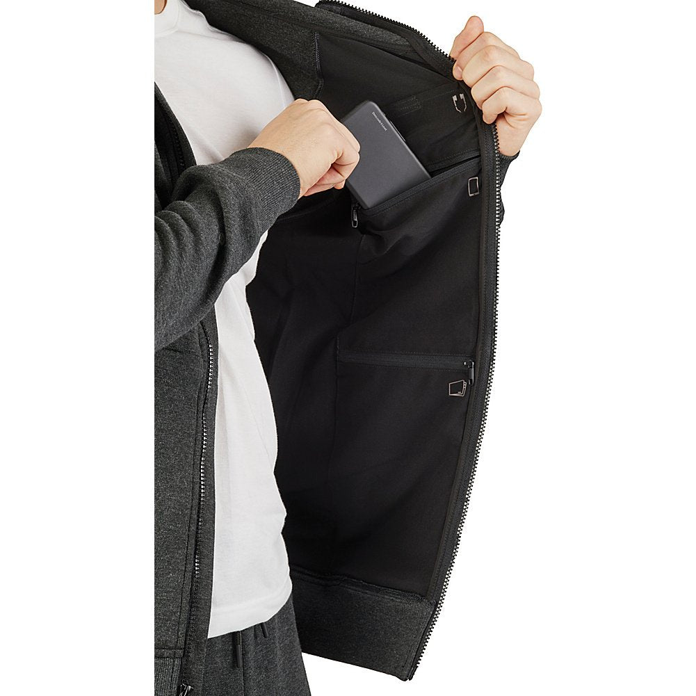 Keep your essential travel items on body and on hand in this comfortable hoodie. With strategically-placed pockets to hold your passport, boarding passes, wallet, phone, tablet and more, itll help you breeze through transit. Made with antibacterial Polygiene treated fabric technology, you can wear more and wash less.