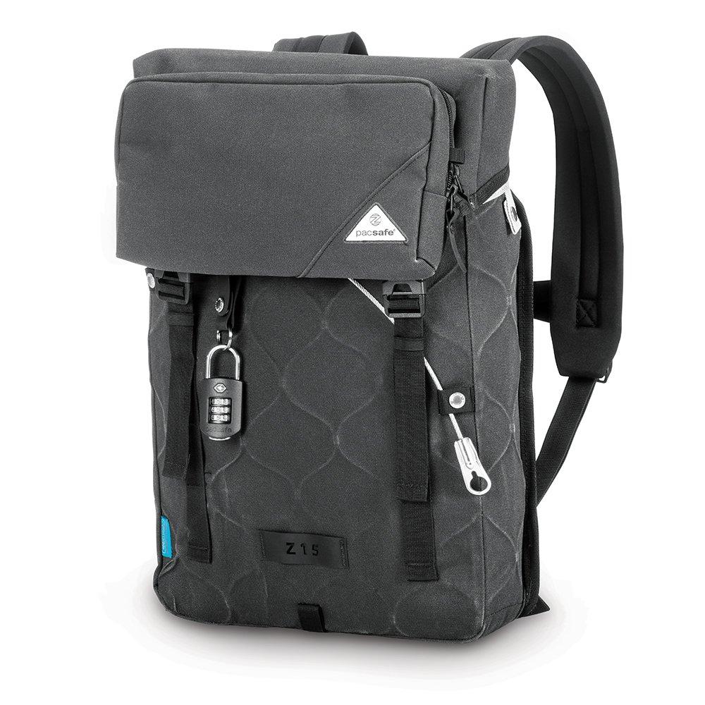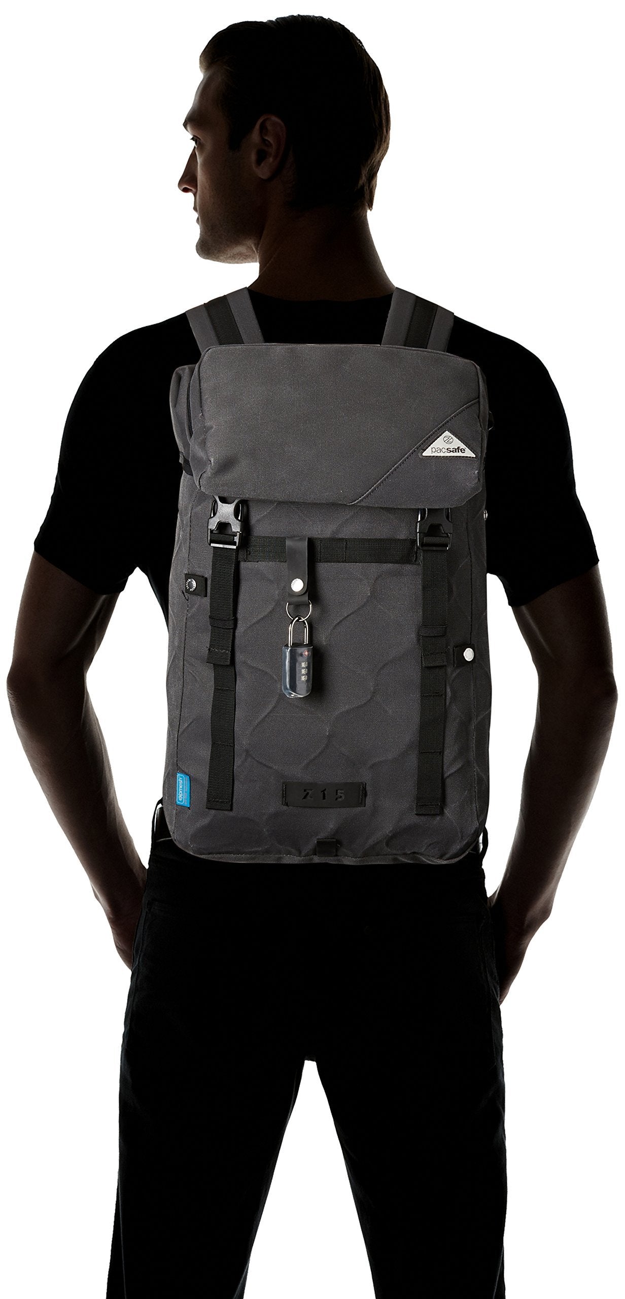 The Ultimatesafe Z15 Backpack from Pacsafe has been designed for the upwardly mobile urbanite who wants a simple, understated style backpack with built-in security features and retro touchpoints. The tough outer canvas fabric masks the even tougher eXomesh 360-degree locking system that helps prevent bag slashers from breaking in stealing those can't-live-without electronics and valuables. The pattern of the patented stainless steel eXomesh weave leaves an imprint on the bag, adding to its already rugged character. The locking system secures the bag completely closed, and comes with a TSA-accepted lock that can be used to lock the bag to a fixture for added security. In addition to the secure main compartment, other features on the Ultimatesafe Z15 include a zippered top compartment with smart zipper security, a padded and removable 15 laptop sleeve with two front pockets, as well as comfortable adjustable shoulder and sternum straps. The bag has a volume of 15-liters and weighs 3.2 pounds. Pacsafe keeps travelers one step ahead of the game by keeping their gear secure from opportunistic thieves with a wide range of stylish adventure backpacks, leisure bags, urban bags, womens bags, and camera bags, as well as luggage and travel accessories.