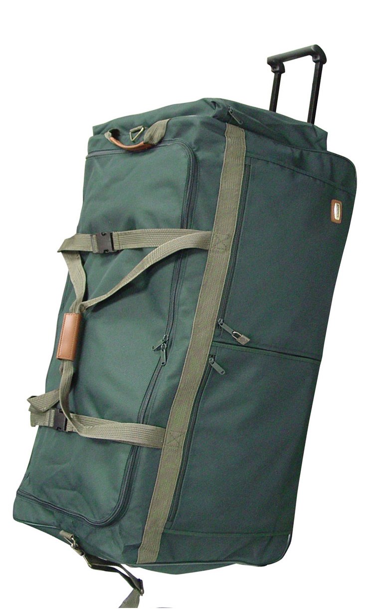 Features a sturdy pull-up handle and dual wheels on the bottom. 2-3 heavy-duty bottom rails help support weight. They also have two zip pockets in front, a zip pocket on one end, a spacious main compartment, top buckled strap, and detachable shoulder strap.