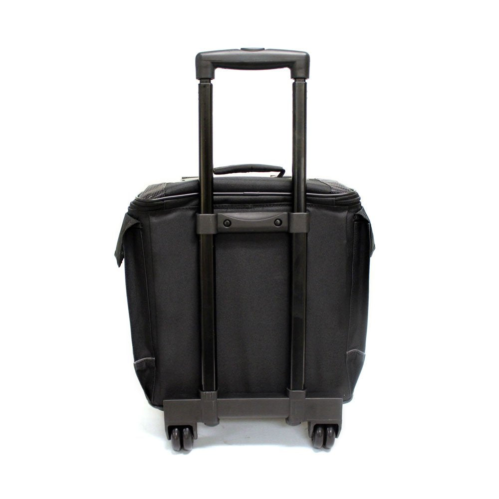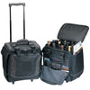 Made of 600D polyester, this unique wheeled case features 12 separate sections, 6 permanent and 6 detachable, allowing it to securely hold bottles in place. The 6 detachable sections are designed to accommodate bottles of various sizes or to be used as a regular cooler. Completely foam padded around the case & sections. Other features include a front organizer to hold a PDA, calculator, cards pens, and incidentals, and dual side pockets for catalogs and memo pads. The soft-grip handle,locking pull-up handle and skate wheels make this convenient case pleasure to pull. The perfect piece of a beverage representative!