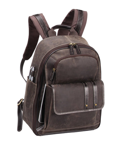 This rugged backpack, done in rich, rustic, full grain leather, highlighted with cream stitching & striped trim, has vintage style with timeless appeal! Features include a flap pocket secured by magnetic closure, with pen loops, dual open pockets, a card pocket, and a zip pocket inside. On the front, theres also a subtle vertical zip pocket to secure a tablet. Inside the spacious main compartment, theres a 15 computer sleeve. On the side, an open pocket and pen loops allow for easy access. A top handle and padded backpack straps finish this fine piece.