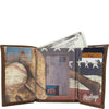 The ultimate gift for the fanatic baseball fan, the Benton Park Vintage Leather Tri-Fold Wallet is made by the hearts of baseball. On the outside this wallet may seem like a typical brown wallet, but wait until you open it up! The interior features a vintage Americana baseball inspired print that coats the 4 card slots, ID window and billfold. This is a wallet any sports fan would not want to be without.