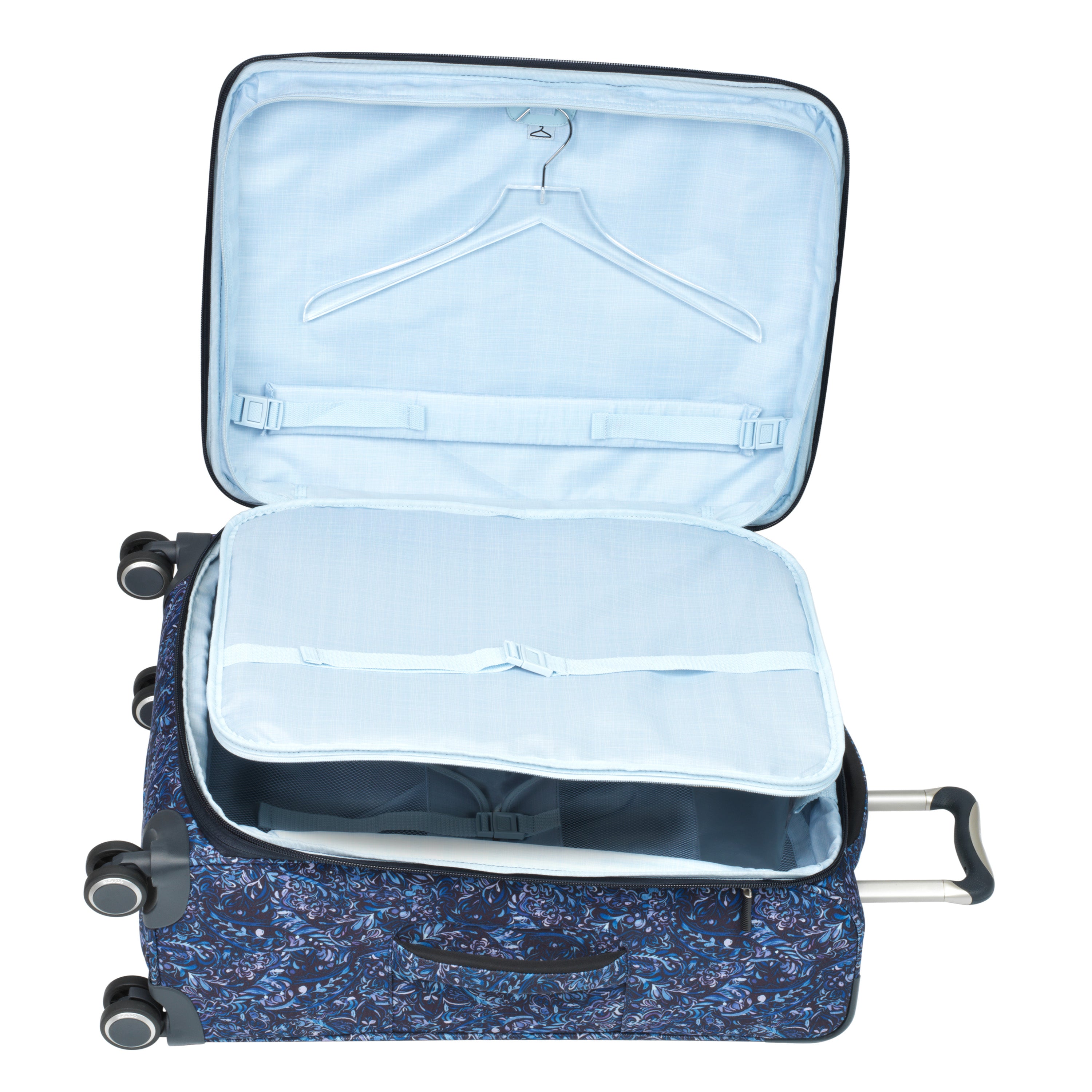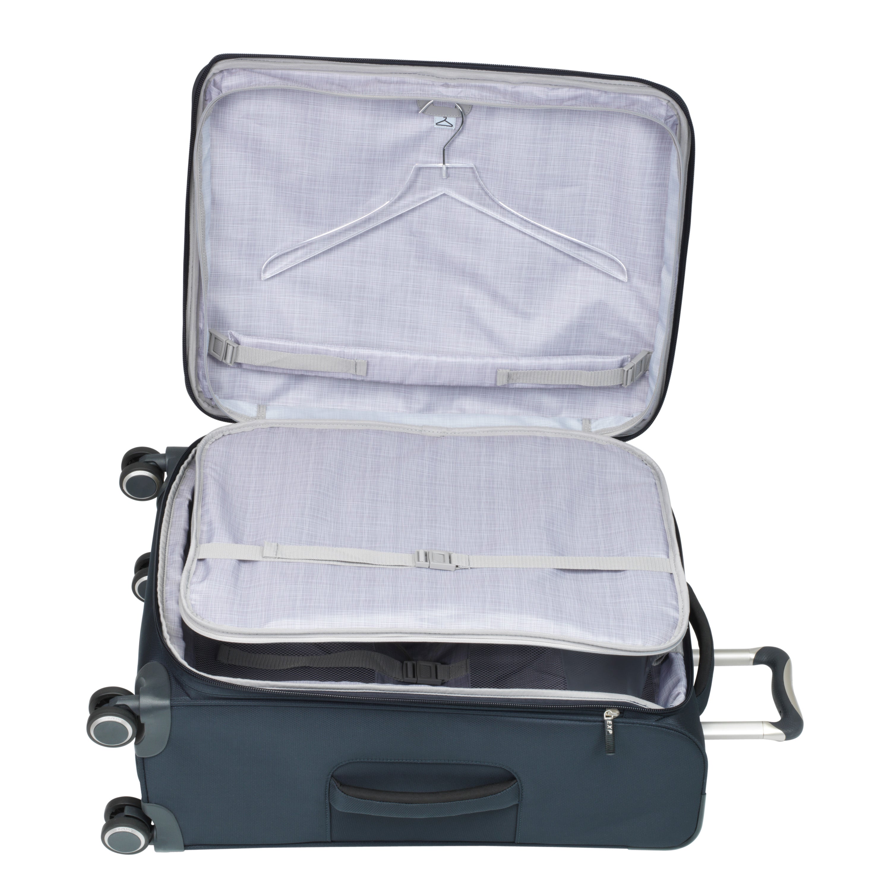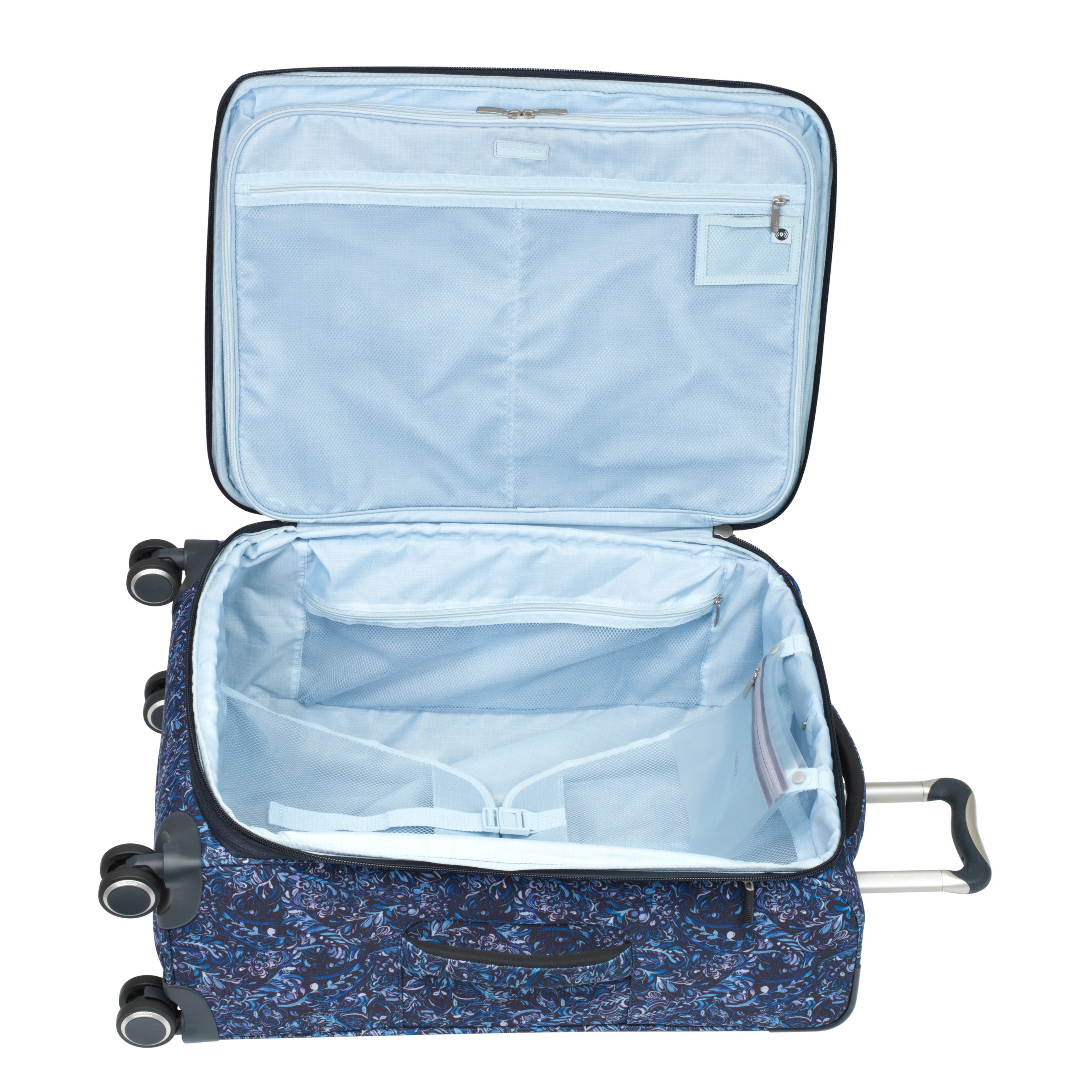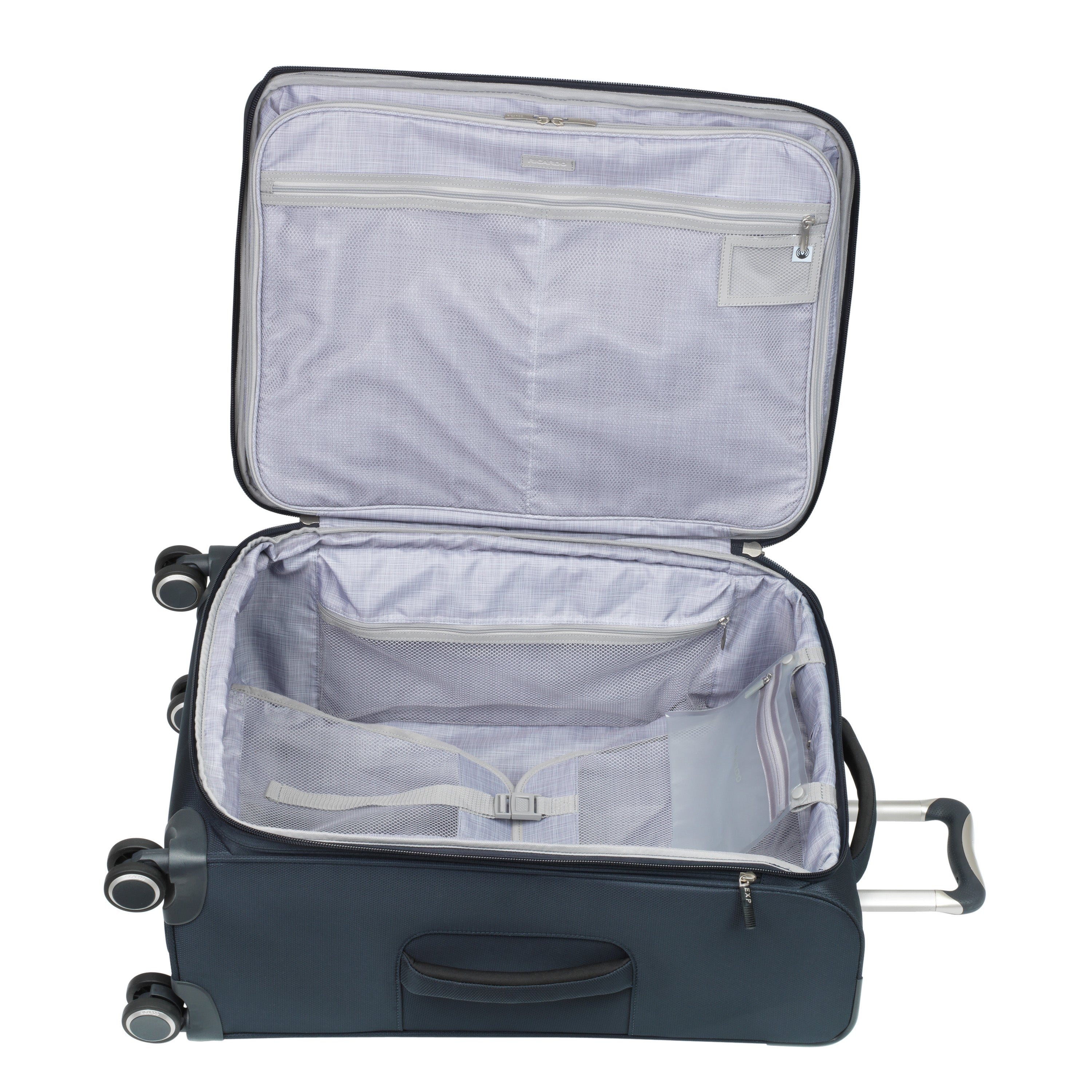 • Large in-lid accessories pocket. Tracker technology pocket. Secondary packing compartment in lid zips open and features a self-adjusting hanger loop and two adjustable straps to secure clothing and protect against wrinkles while traveling.