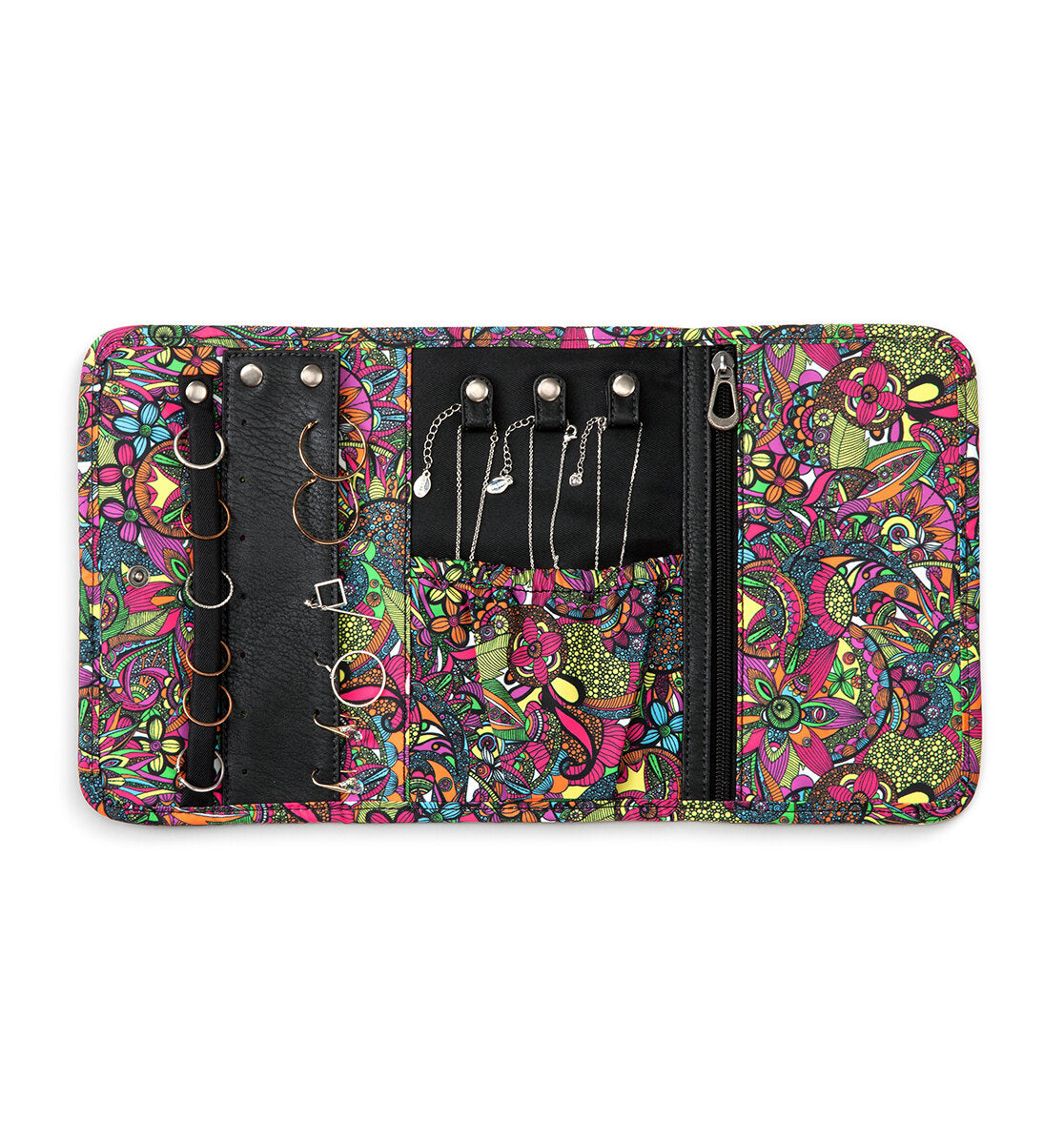 • Interior contains 1 zipper pocket, 1 earrings holder, 1 rings holder, 3 snap hooks and 1 elastic pouch