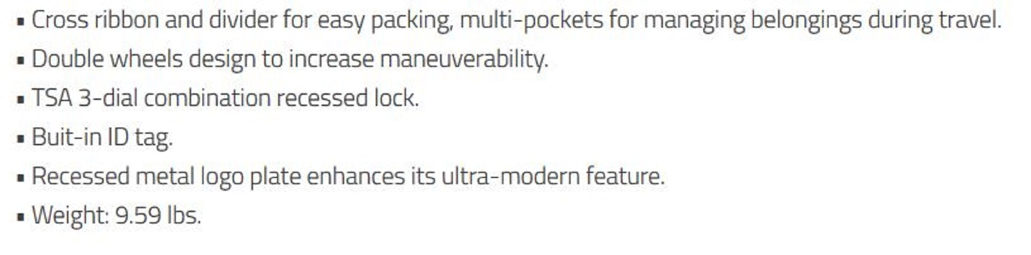 • Cross ribbon and divider for easy packing, multi-pockets for managing belongings during travel.