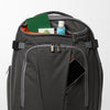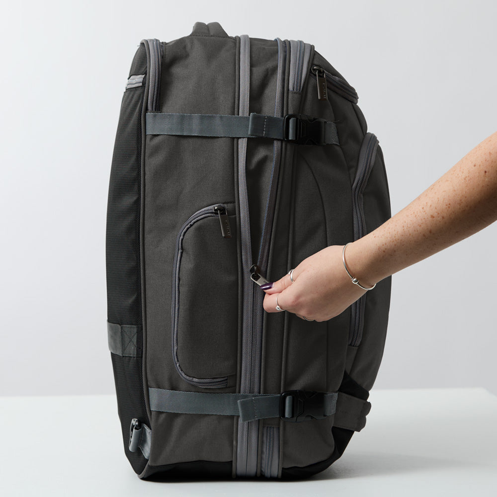 This backpack has tons of pockets strategically placed inside and out so everything has its place. Not only is it easy to organize, but its expandable with external compression straps so you can still fit your favorite backpack in the overhead bin.