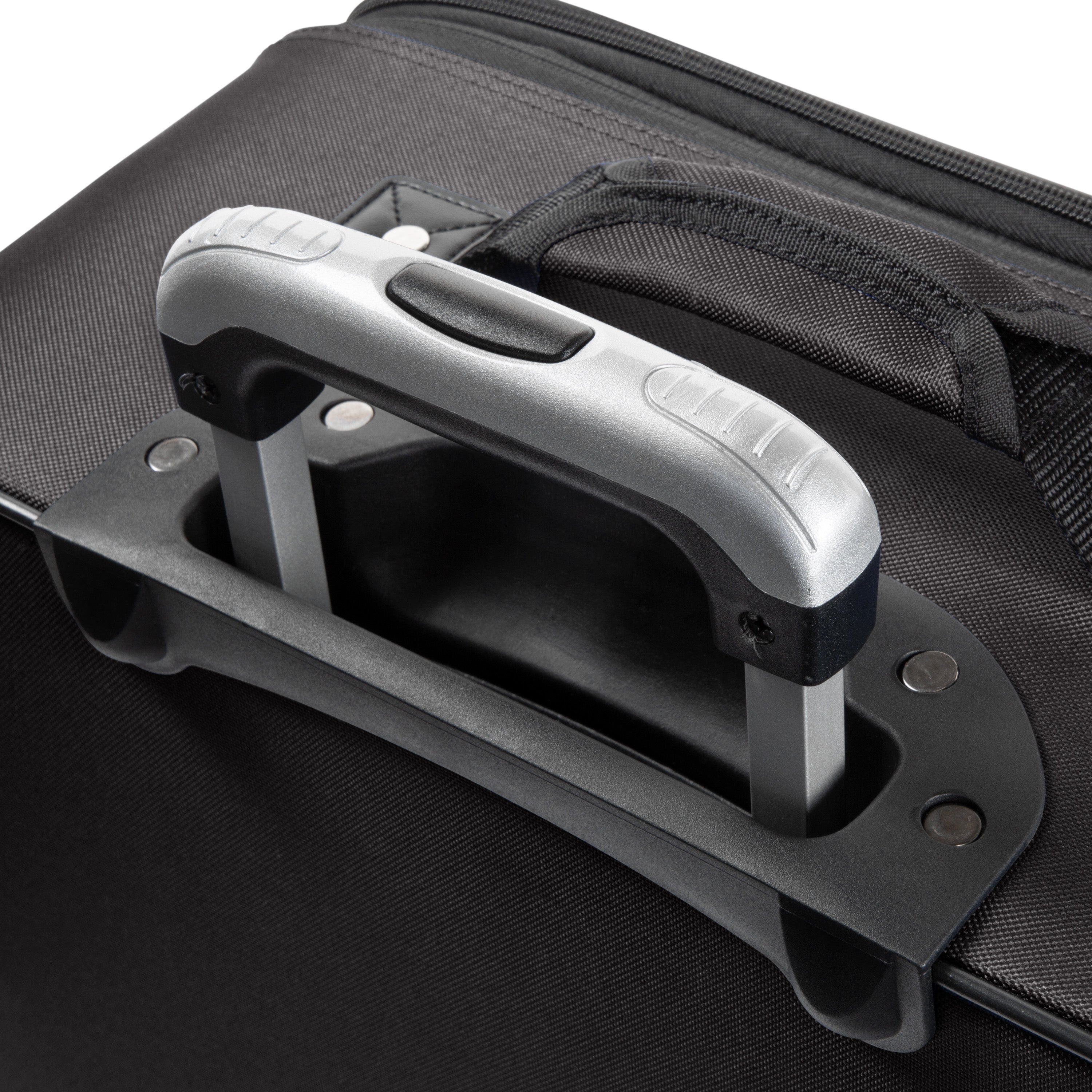 • Lightweight, durable exterior fabric resists abrasion and tearing while providing superior protection against the elements. A multi-stage retractable handle with ergonomic grip fits comfortably in hand for optimal comfort and easy movement.