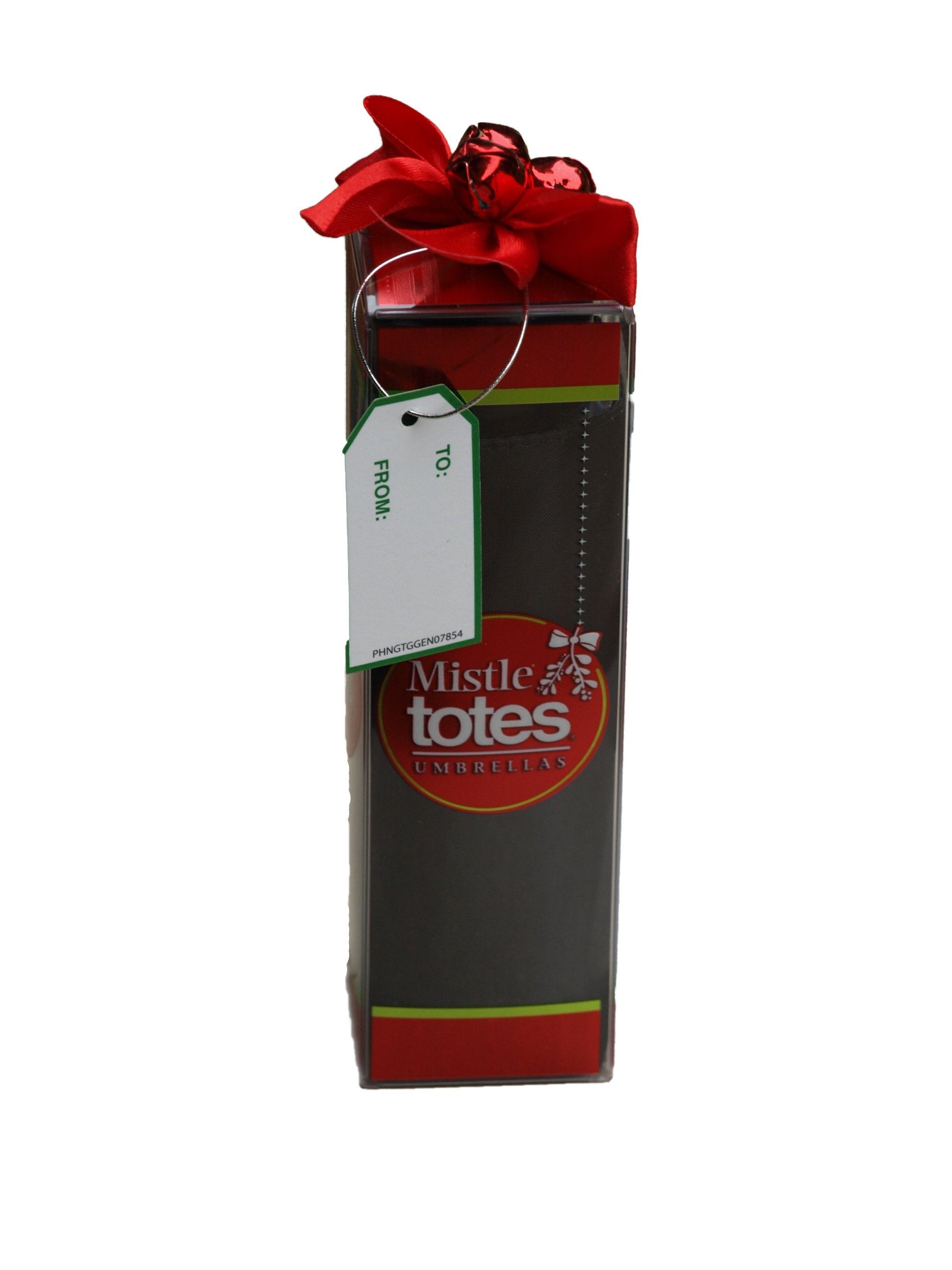Give a Mistle totes 'brella to someone special on your list. Available in ahuge selection of colorful fashion prints for use all year long. The Mistletotes 'brella is lightweight and compact. Fits easily into a purse or handbag!Provides exceptional rain protection under a 38" canopy (arc dimension).Mistle totes umbrellas come in a beautiful holiday gift box with bow andbells. There's is even a gift tag attached. Who knew gift giving could be soeasy! This holiday make someone you care about smile under a Mistle totes'brella