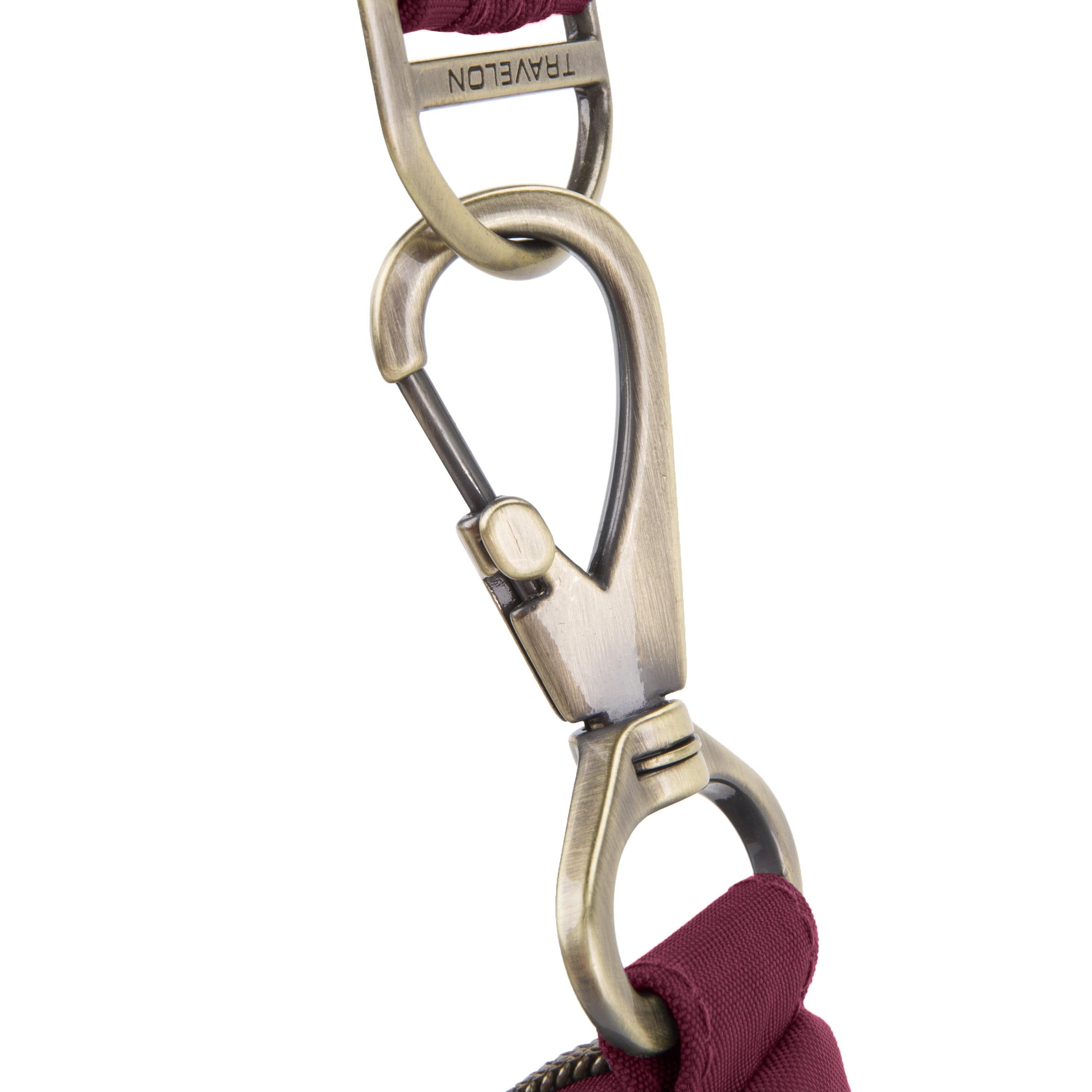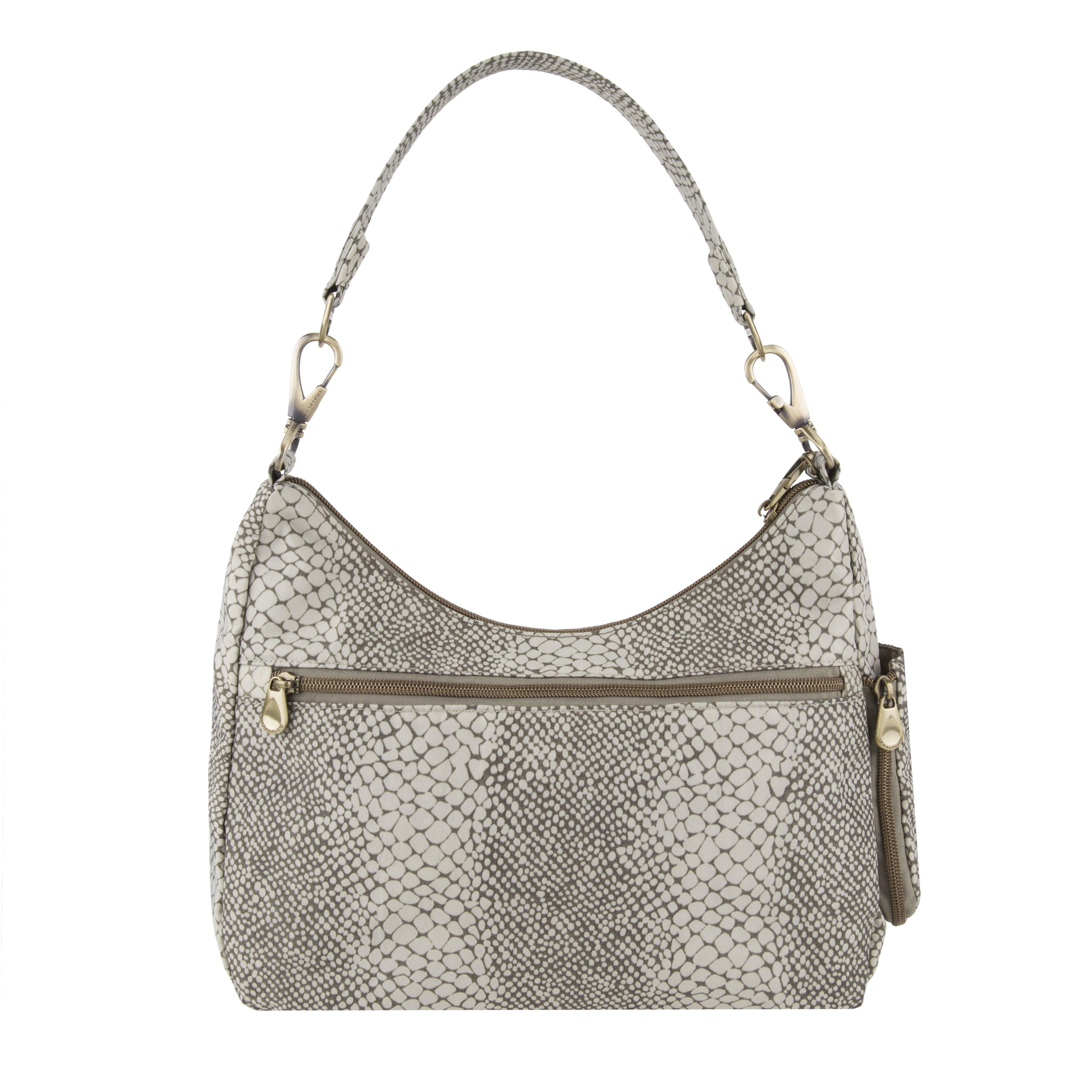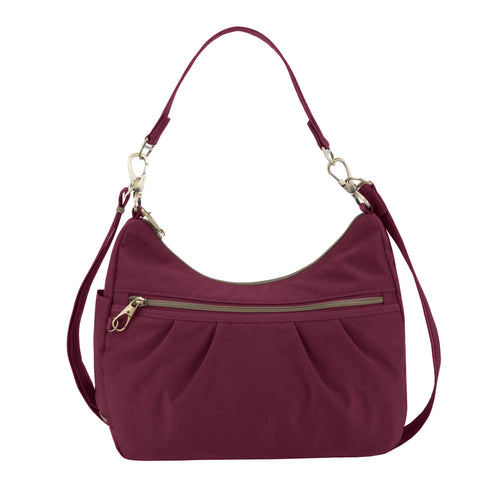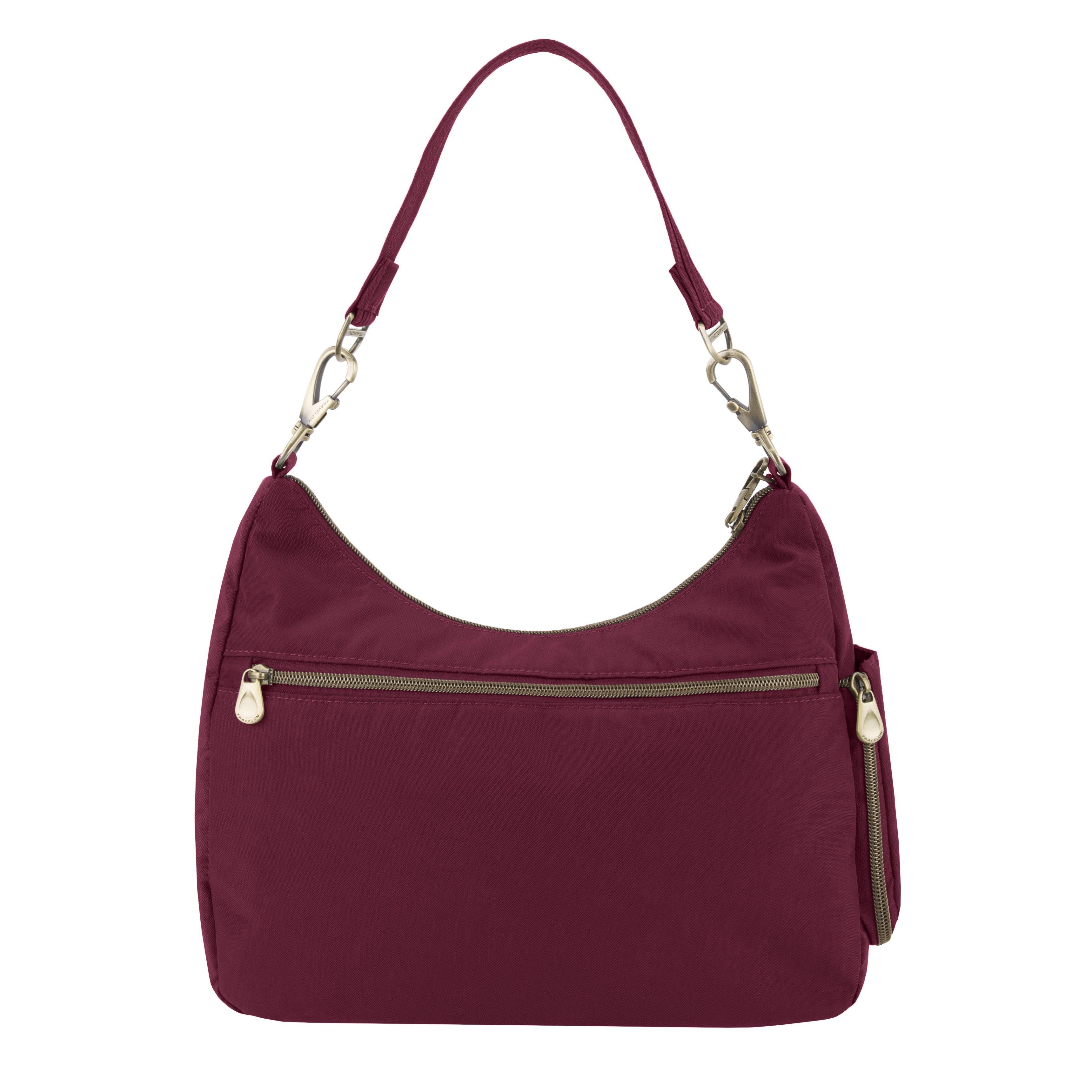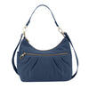 The Signature Hobo bag is trendy, fashionable and easy to carry. The main compartment has 5 RFID card slots, RFID Passport pocket, wall pocket, drop pocket plus large enough for an iPad. Other features include dual removable slash & cut resistant straps, locking swivel clasp that can be attached to a stationary object, a mesh expansion pocket and front & rear zippered pockets. Made from durable water & stain resistant nylon material and accented in beautiful antique brass finished hardware