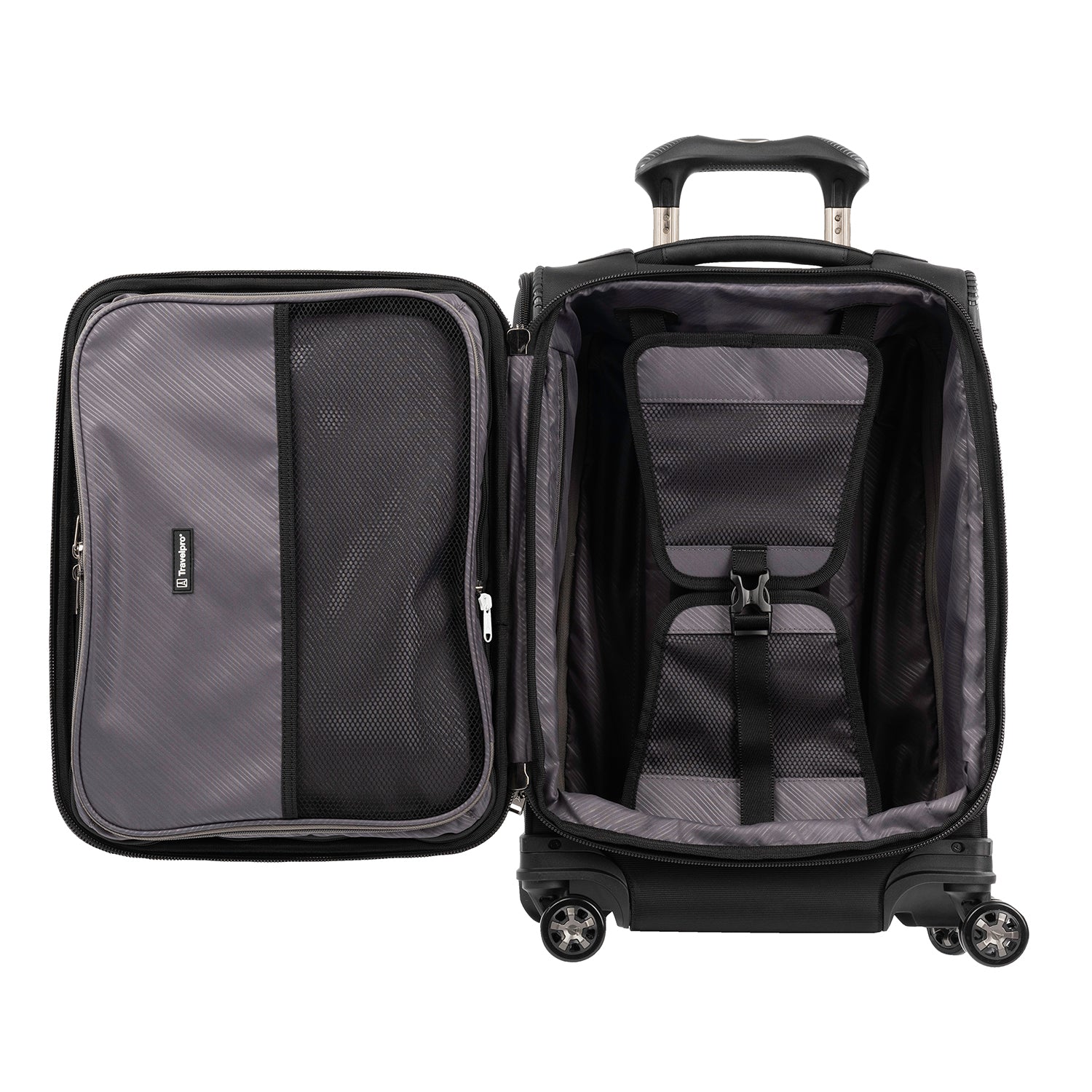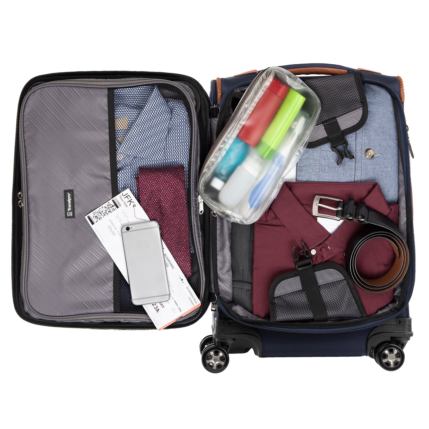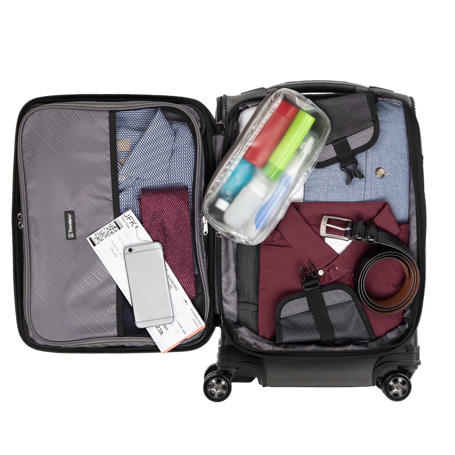 Go anywhere with a spinner that is all your own. The Crew VersaPack Global Carry-on Expandable Spinner is designed for total packing versatility and customizable with a variety of interchangeable Travelpro exclusive Zip-In Organizers. Included inside the lid is a removable Zip-In Garment Organizer, ideal for storing folded shirts, dresses and jackets. Also available for purchase separately are three additional coordinating Travelpro exclusive Zip-In Organizersa Laundry Organizer for bathing suits, workout clothes and other damp items, a Packing Cubes Organizer for shorts, t-shirts and accessories and an All-In-One Organizer for wet and dry storage. Carry-on compliant with 80% of the worlds largest airlines*domestic and international, this spinner also features a tip-resistant zippered expansion option that increases packing space up to two inches. Enjoy total convenience with a built-in USB port and dedicated exterior power bank pocket, exterior padded laptop pocket and removable TSA-compliant toiletries bag that stores perfectly in a same-sized exterior pocket. Plus, this spinners PrecisionGlide System ensures precise control and effortless roll on eight ultra-durable, 360 MagnaTrac Spinner Wheels led by a four-stop, height-adjustable PowerScope Handle with comfortable Contour Grip. Built for professional-grade dependability with robust corner armor, skid guards and heavy-duty wheel housings, Crew VersaPack is the civilian version of the luggage flight crews use, tested to meet the same superior quality and durability standards. This spinner is further backed by the comprehensive.
