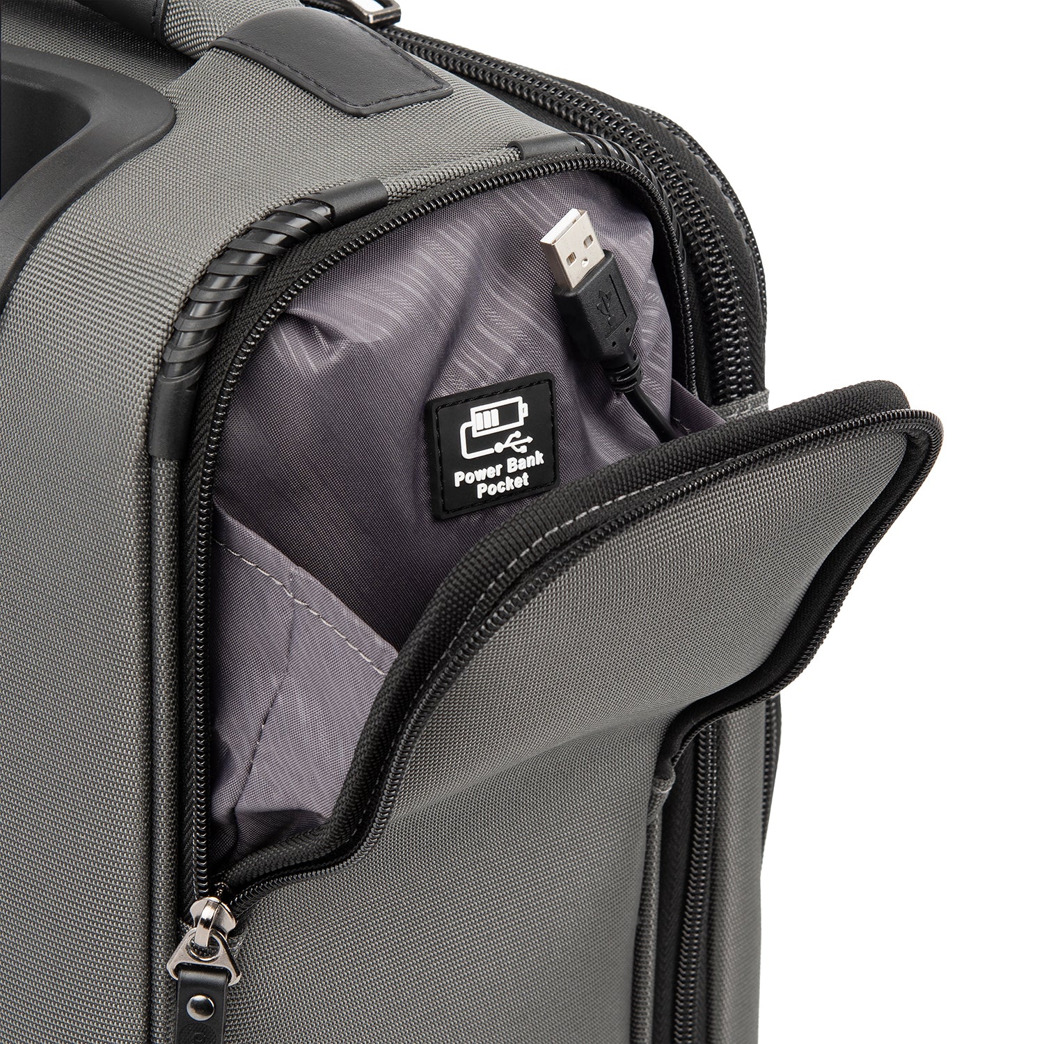 • Exterior power bank pocket provides FAA-compliant power connected to an external USB Port (battery not included). Exterior, padded pocket fits laptops up to 15.6". Cushioned, low-profile top and side carry handles along with bottom handle cup provide comfortable carrying options.