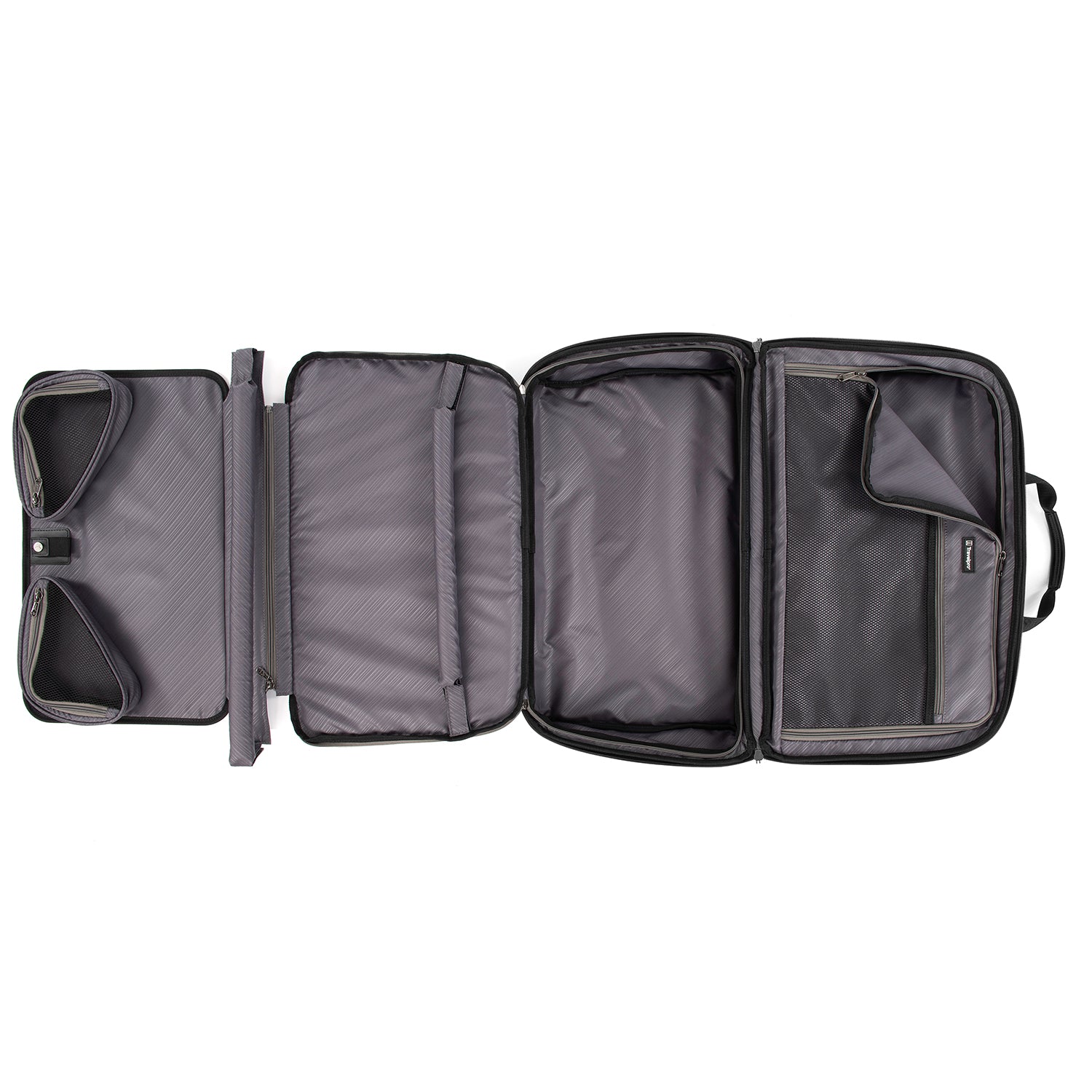 • Exterior side pocket is ideal for a water bottle or umbrella. Quick-access front pocket includes a key fob and organizational compartments. Removable, fold-out suiter system offers intelligent packing flexibility.