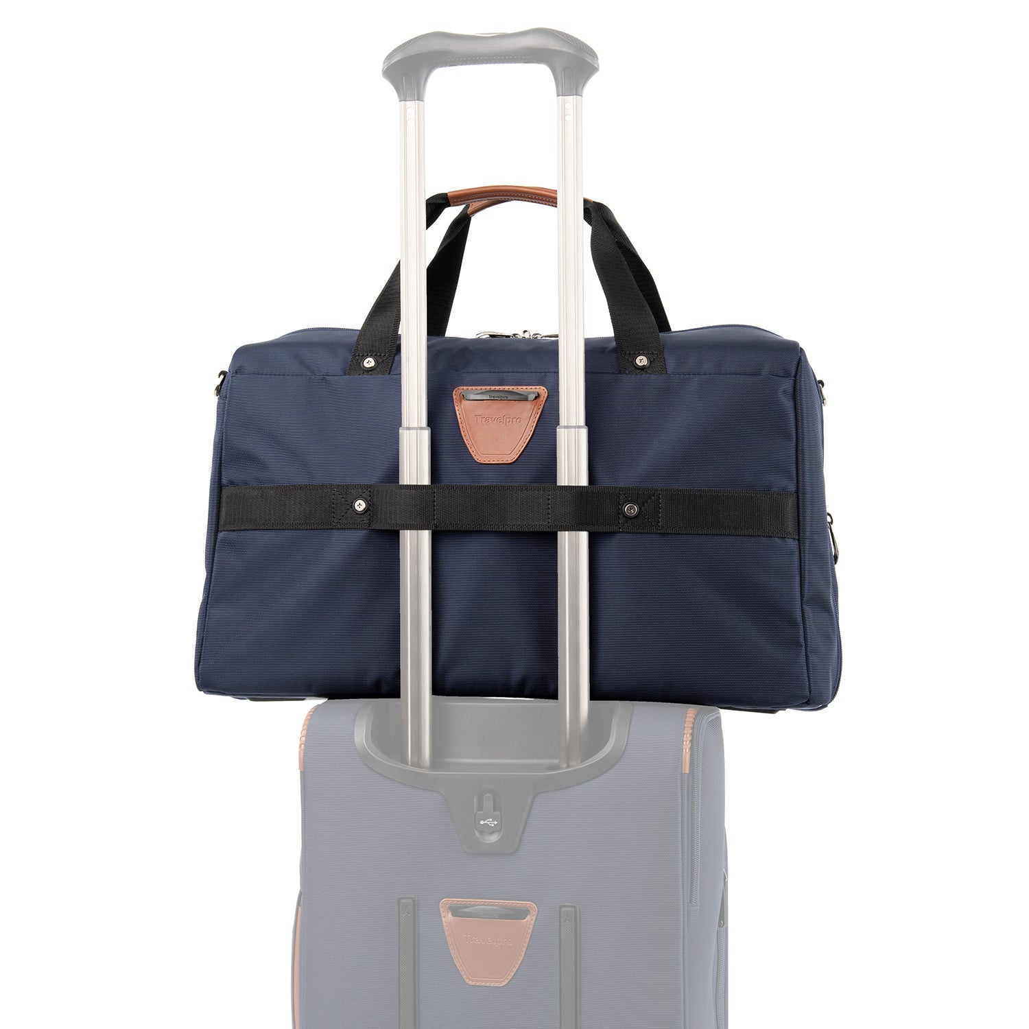 • Rear strap fits around the extension handle of a Rollaboard or spinner suitcase for secure stacking and hands-free mobility.