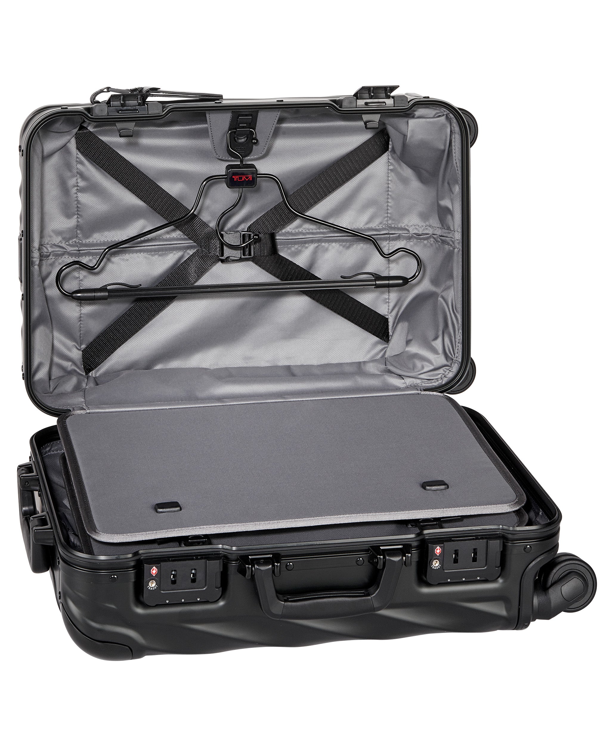• Frame system opening, 2 TSA integrated combination locks with push button to open, 3-stage telescoping handle system with push button, Retractable top and side carry handles, 4 dual-spinning wheels, Hanger bracket, Protective bumpers