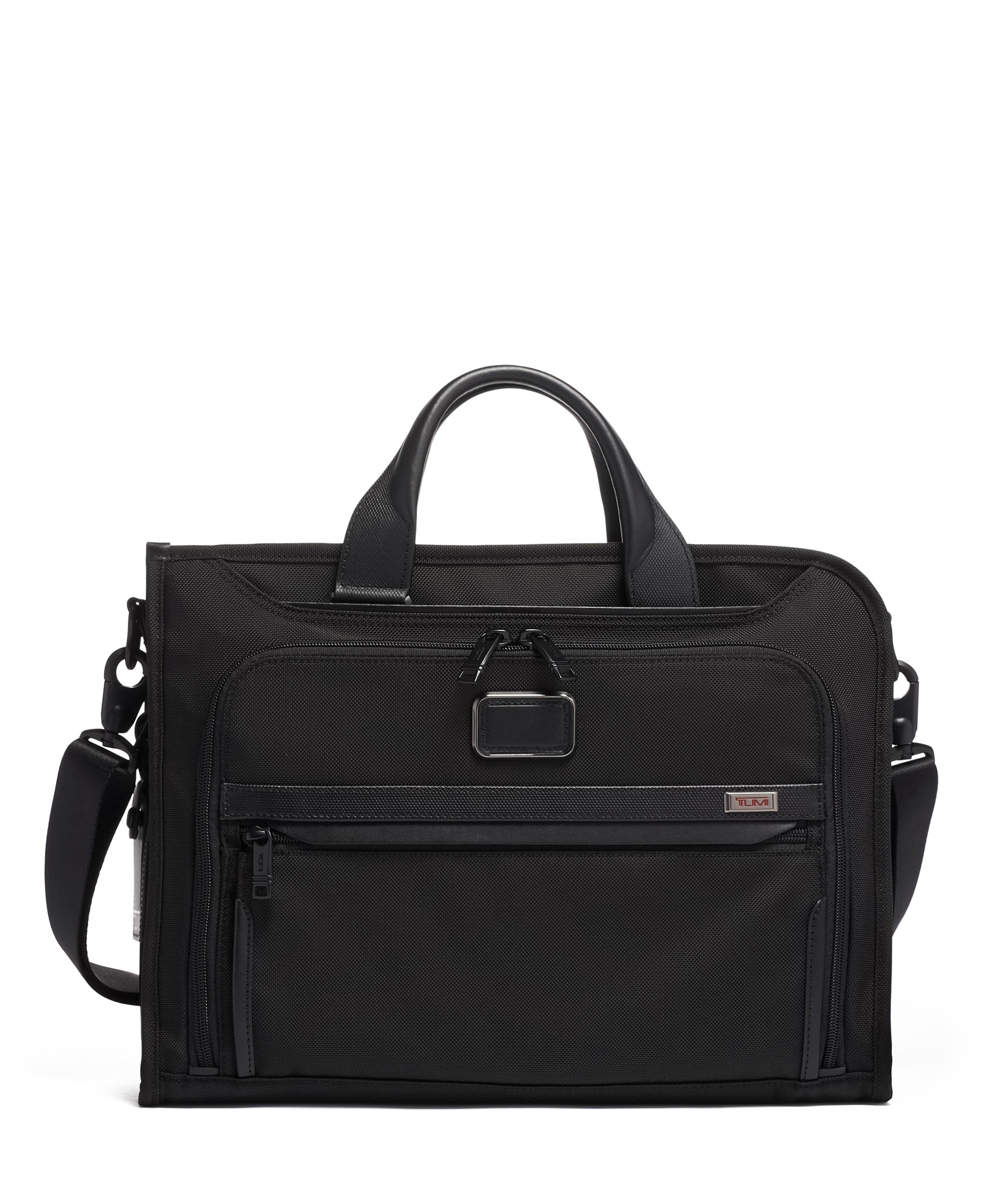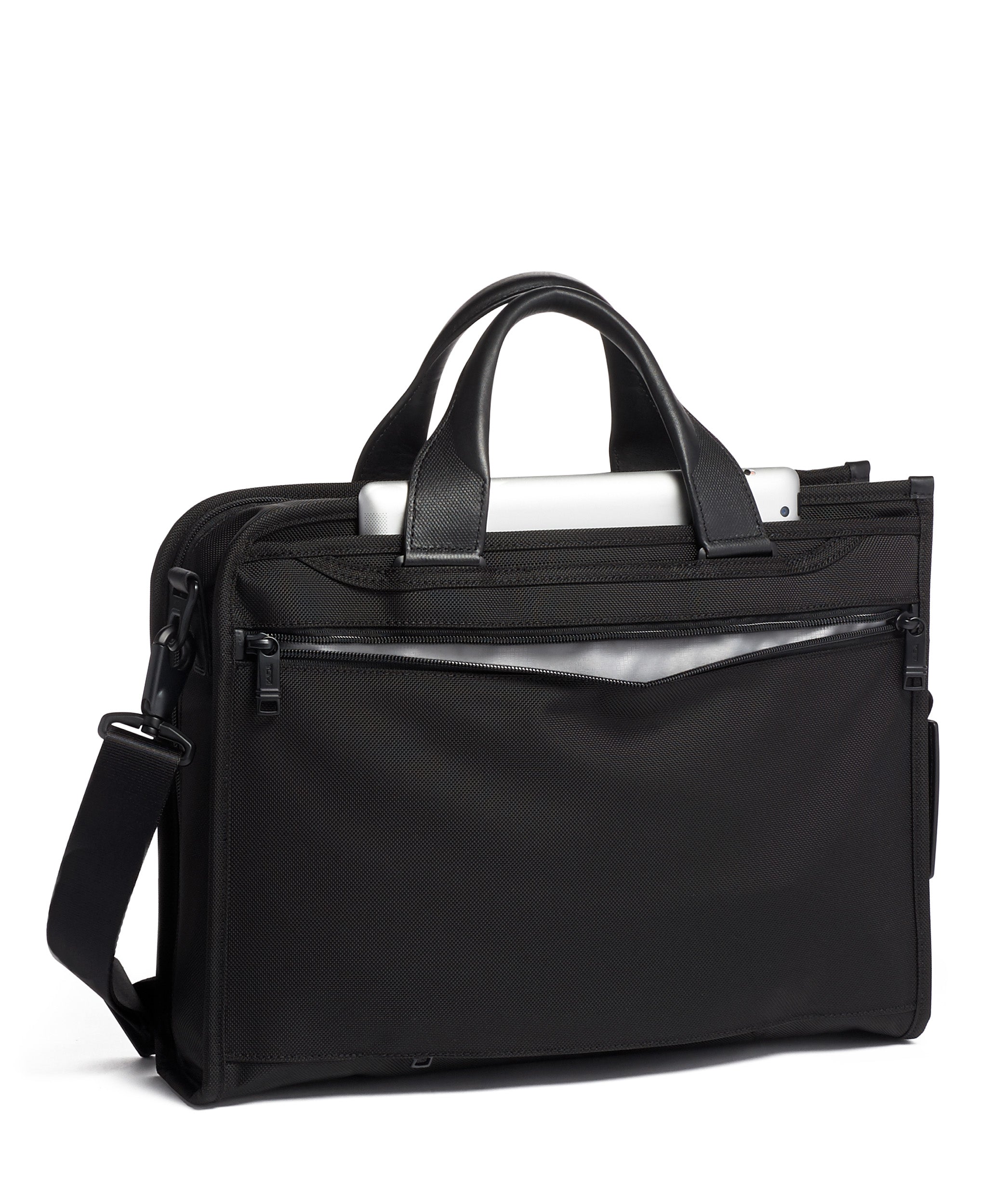 • Padded tablet pocket, 2 zip pockets, 6 media pockets, Open pocket, 3 card pockets, Pen loops, Key leash, TUMI Tracer