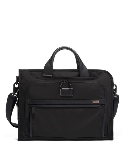 This slim portfolio-style brief features a zip-around opening for easy access to the main compartment. The interior features a padded tablet pocket, and multiple pockets for tech and business accessories. A magnetic slip pocket on front lets you stash and retrieve your phone effortlessly. Part of our Alpha 3 Collection, made from TUMIs patented, ultra-durable FXT ballistic nylon. Our iconic business and travel pieces bring together innovative design, superior performance, and best in class functionality. Select styles come outfitted with a colorful TUMI Accents Kit luggage tag, monogram patch, handle wrap and zipper pull ties for an additional cost.