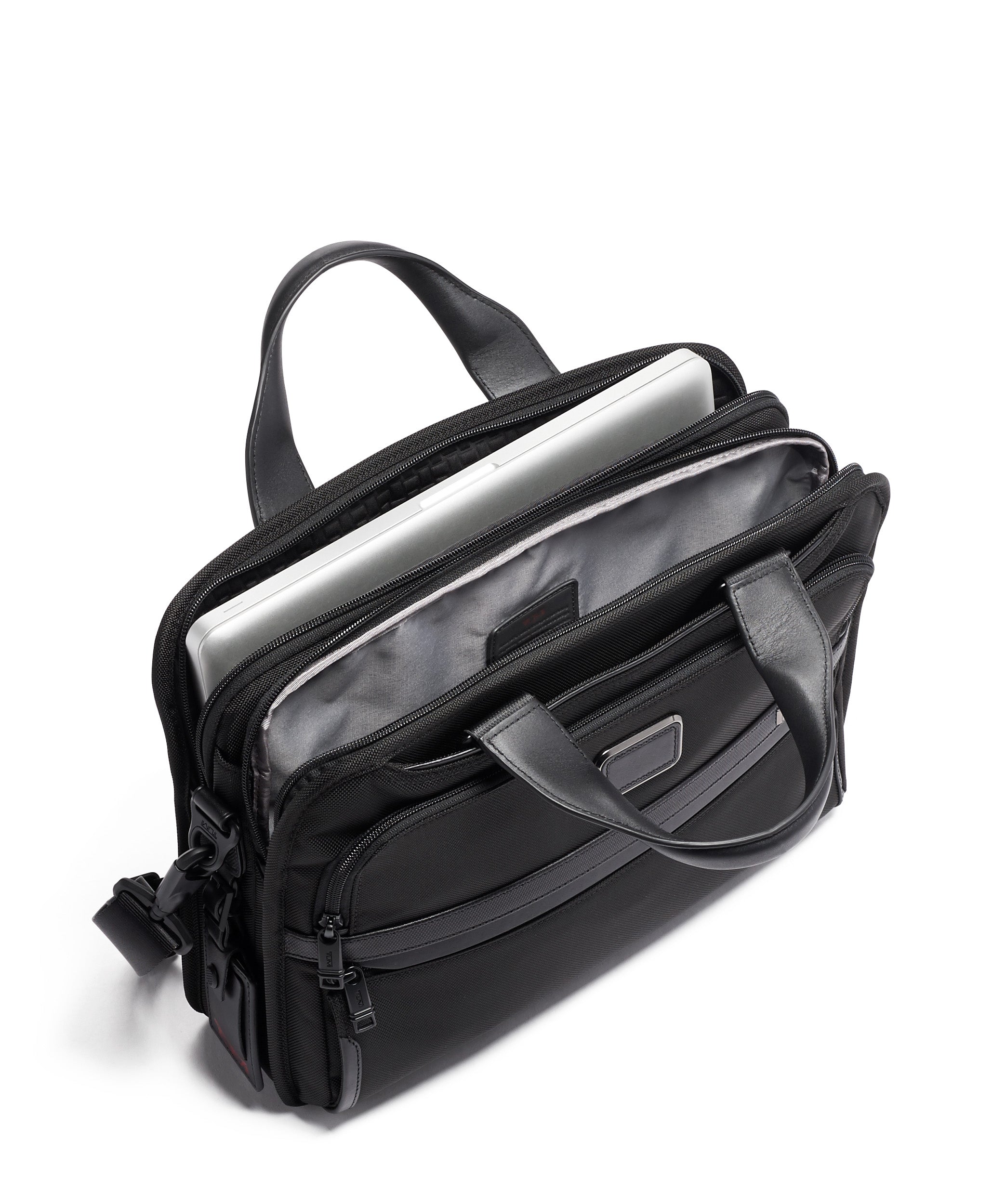 • Padded tablet pocket, Zip pocket, 6 media pockets, Open pocket, 3 card pockets, Pen loops, Key leash, TUMI Tracer