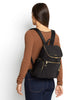 - Double-zip entry to main compartment, Single-zip front pocket with locking zipper pull, Double-zip side pocket with water-resistant water bottle pocket, Single-zip side pocket, Leather top handle, Add-a-Bag sleeve, Padded adjustable backpack straps,